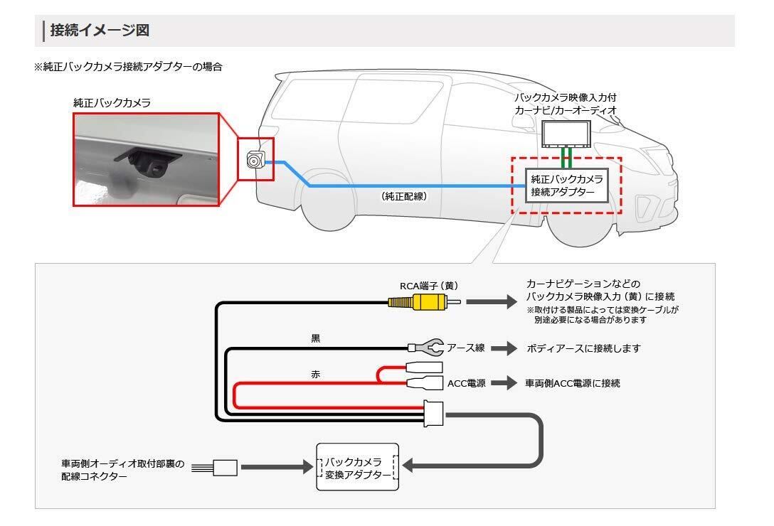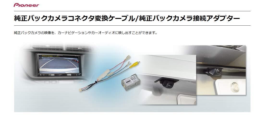 「AVIC-CL900-M/CW900-M/CZ900-M/CL900/CW900/CZ900」、車種専用モデルに「ND-BC8-II」などRCA出力の汎用バックカメラを接続するための変換コネクターです。