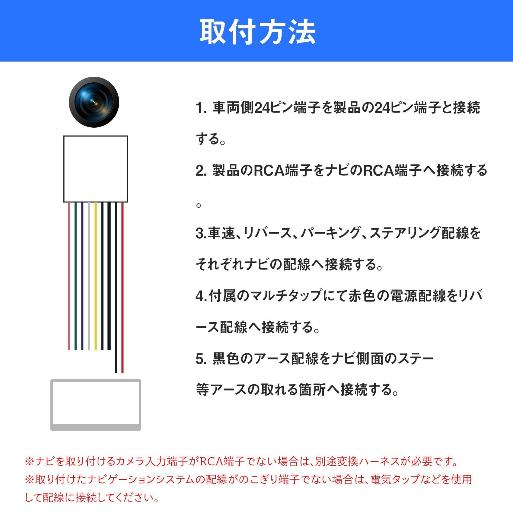 ▶製品の使用:24ピン コネクタ 専用 バックカメラ を、RCA ピン 端子に 変換 して 市販ナビ に 接続 する 変換 アダプター