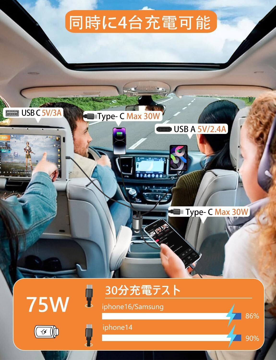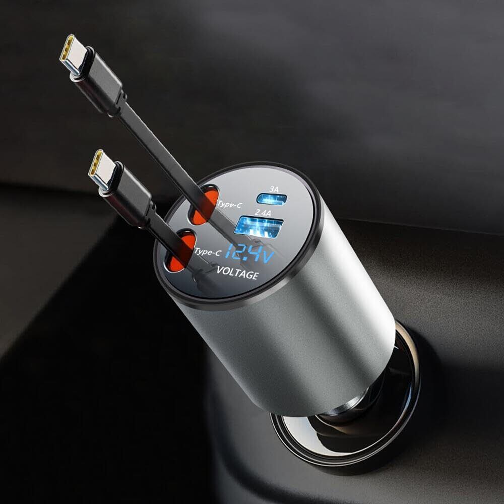 VIKNAN 巻き取り式充電ケーブル 車 充電器 タイプc 2本 シガーソケット 4台同時充電可能 車載充電器 カーチャージャー 急速充電 電圧表示 12V/24V対応 iPhone/Android対応