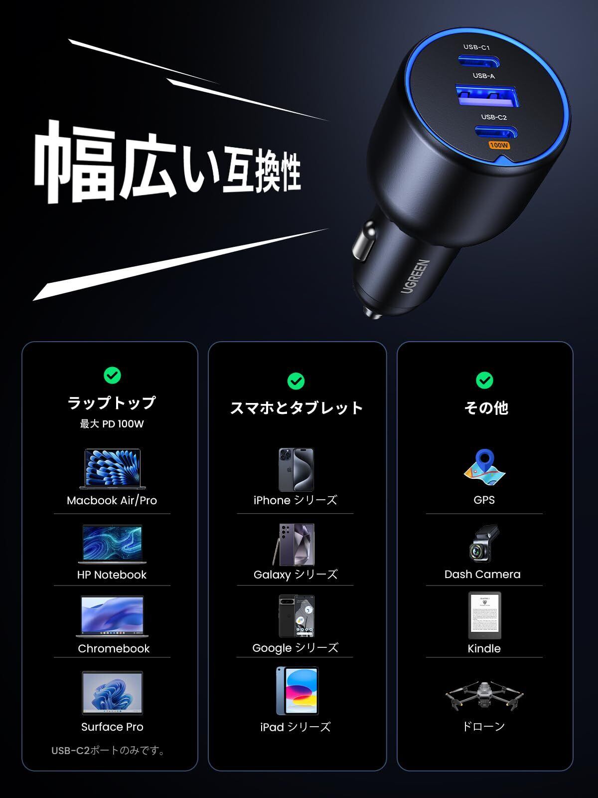 【幅広い互換性】本製品カーチャージャーはMacBookをはじめとするUSB-Cポート搭載ノートPCから、普段お使いのスマートフォンまで様々な機器を本製品ひとつで同時に充電することができます。又は一般乗用車で主に使用されている12V規格はもちろん、トラックなどの大型車両の24V規格のシガーソケットでも使用が可能。