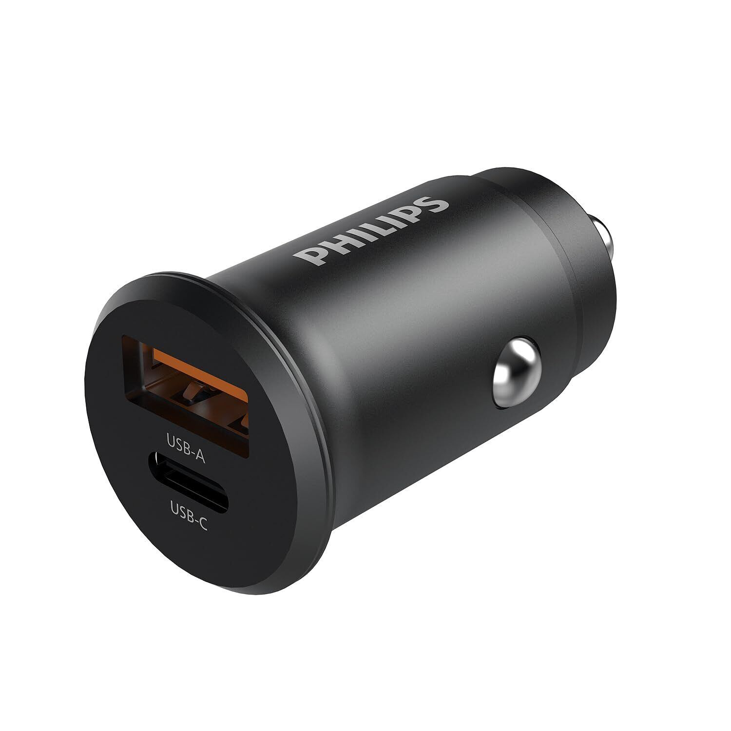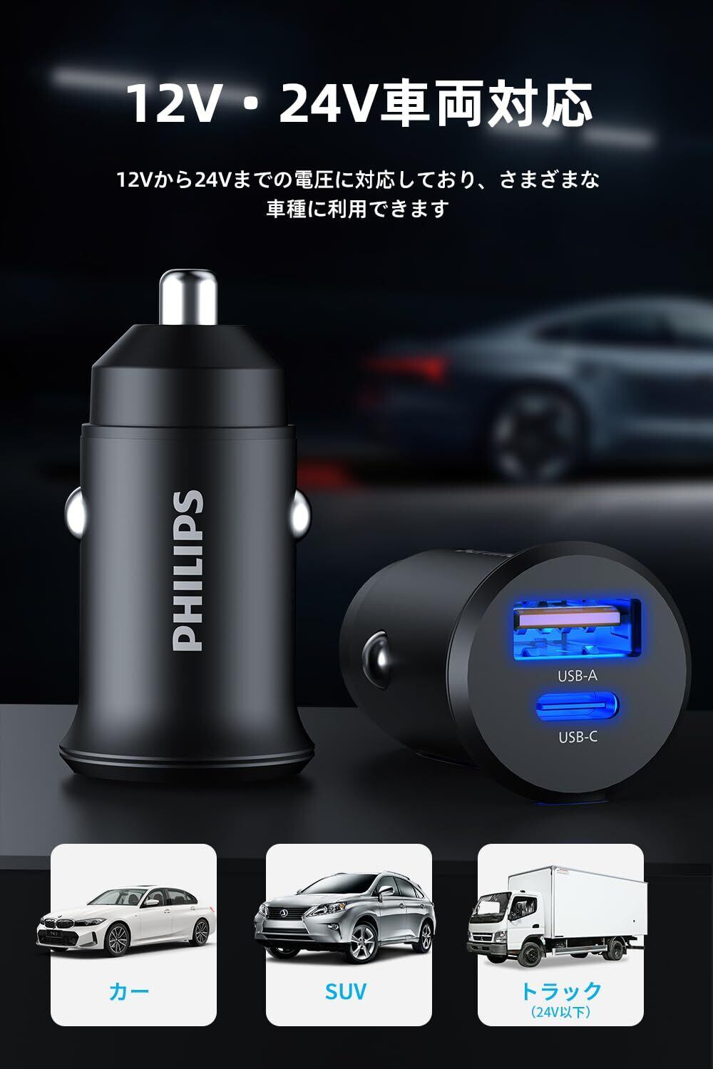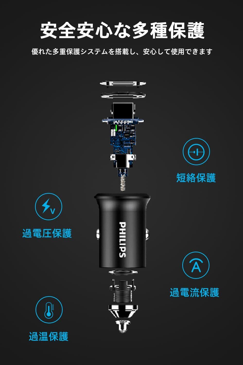 Philips (フィリップス) 2ポート かーチャージャー 30W急速充電 PD&QC対応 シガーソケット USB-A&USB-C スマートIC搭載 車載充電器 超小型 12/24V車対応 DLP3520N