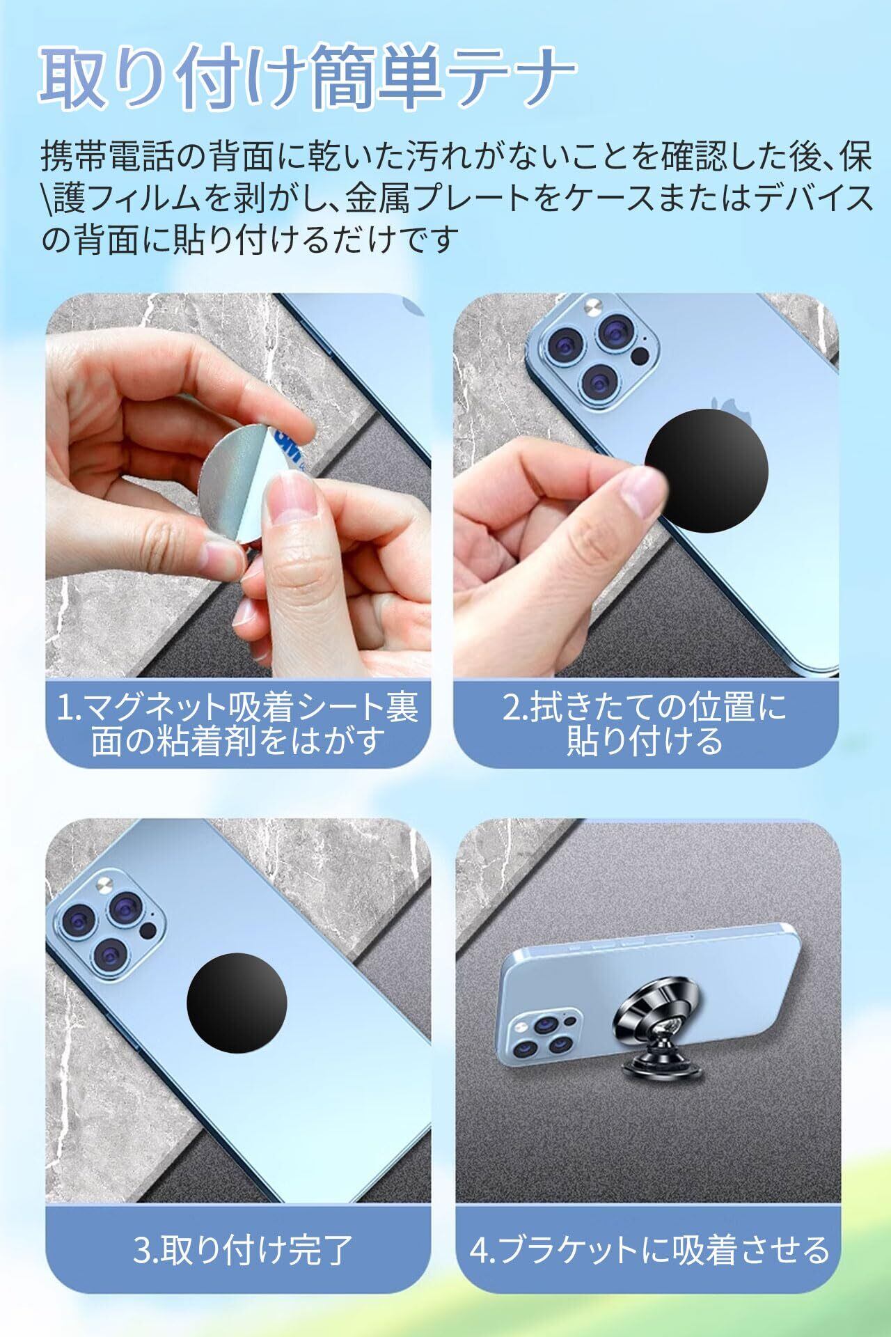 ️【取り付けも簡単】スマホケースの裏面や外面、スマホ本体の裏面に貼り付けます。ご注意:ワイヤレス充電機種には、本体裏面のワイヤレス充電センサーから離れて貼ってください。スマホケースの場合は厚さ1mm未満のケースしか対応しません。
