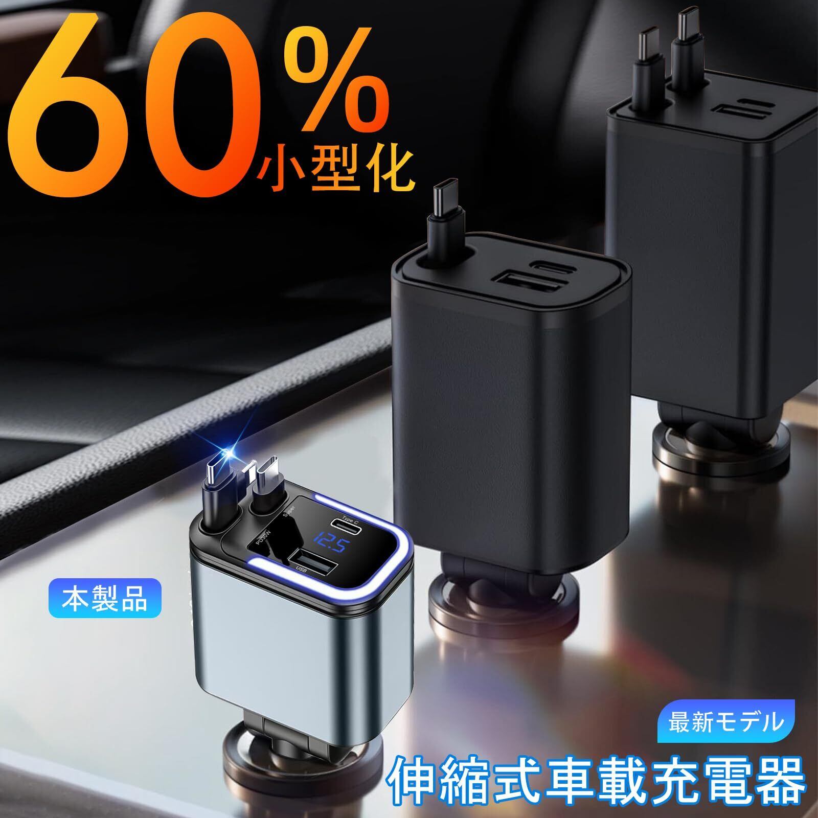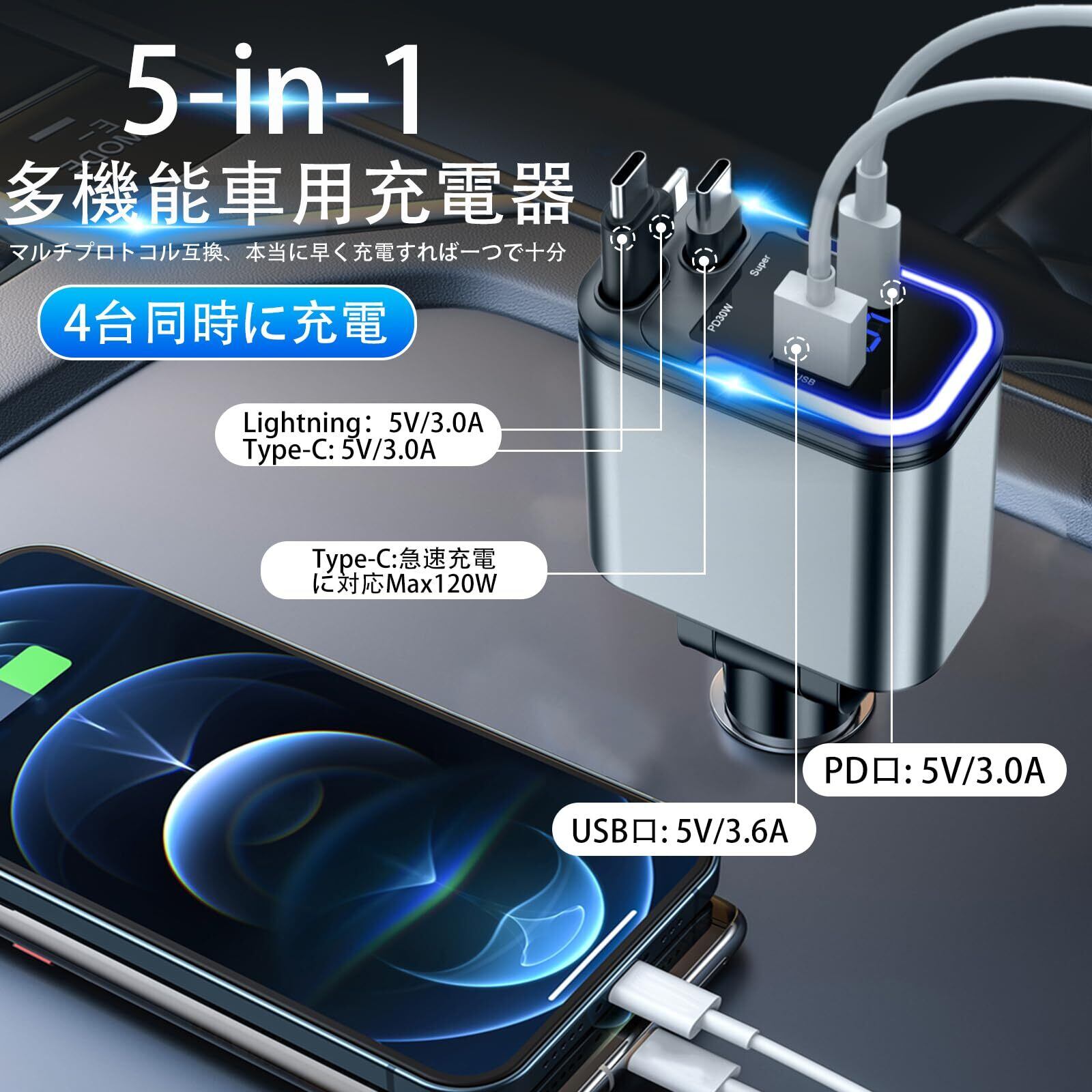 【様々な組み合わせから選択& 4台まで同時充電可能】2026年最新モデルのロール式車載充電器です。たった一つで、あなたのすべての機器のニーズを満たします。デュアルtype-c、シングルtype-c +Lightning、シングルtype-c、シングルLightningの4つの組み合わせが可能です。USBポートも2つあり、最大4台のスマートフォンを同時に充電できます。 Type-C(120W)+ iPhone(PD30W)巻き取り式ケーブルに加え、USB-C(QC15W)&USB-A(QC15W)の4ポート搭載します。車内の配線の乱れを根本的に解決し、ケーブルが絡まるのを防ぎ、清潔な充電環境を実現します。注意:製品パネルの表面には保護膜があり、使用前にはがすとピカピカになります。