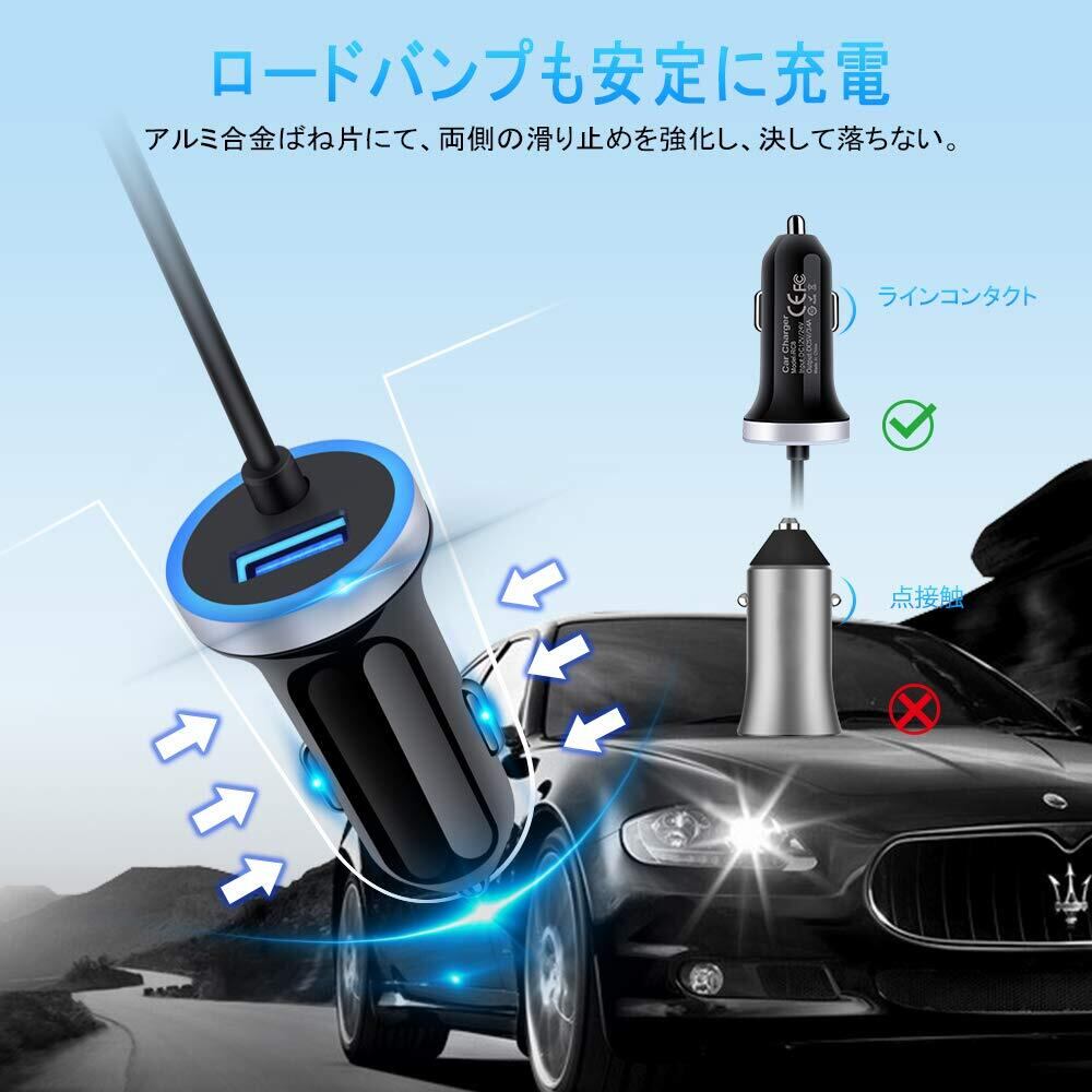 【高級感に溢れる車載充電器 】高級車でのご使用にも違和感を感じさせないシンプルなデザインです。通電時LEDライトが青く光り、夜の暗い車内でも一目で確認できます。USBポートカーチャージャーの先端は長い端子を採用、また両側に滑り止めメタルドーム付き、しっかりとシガーライターに固定されてグラグラしたり、脱落したりしません。