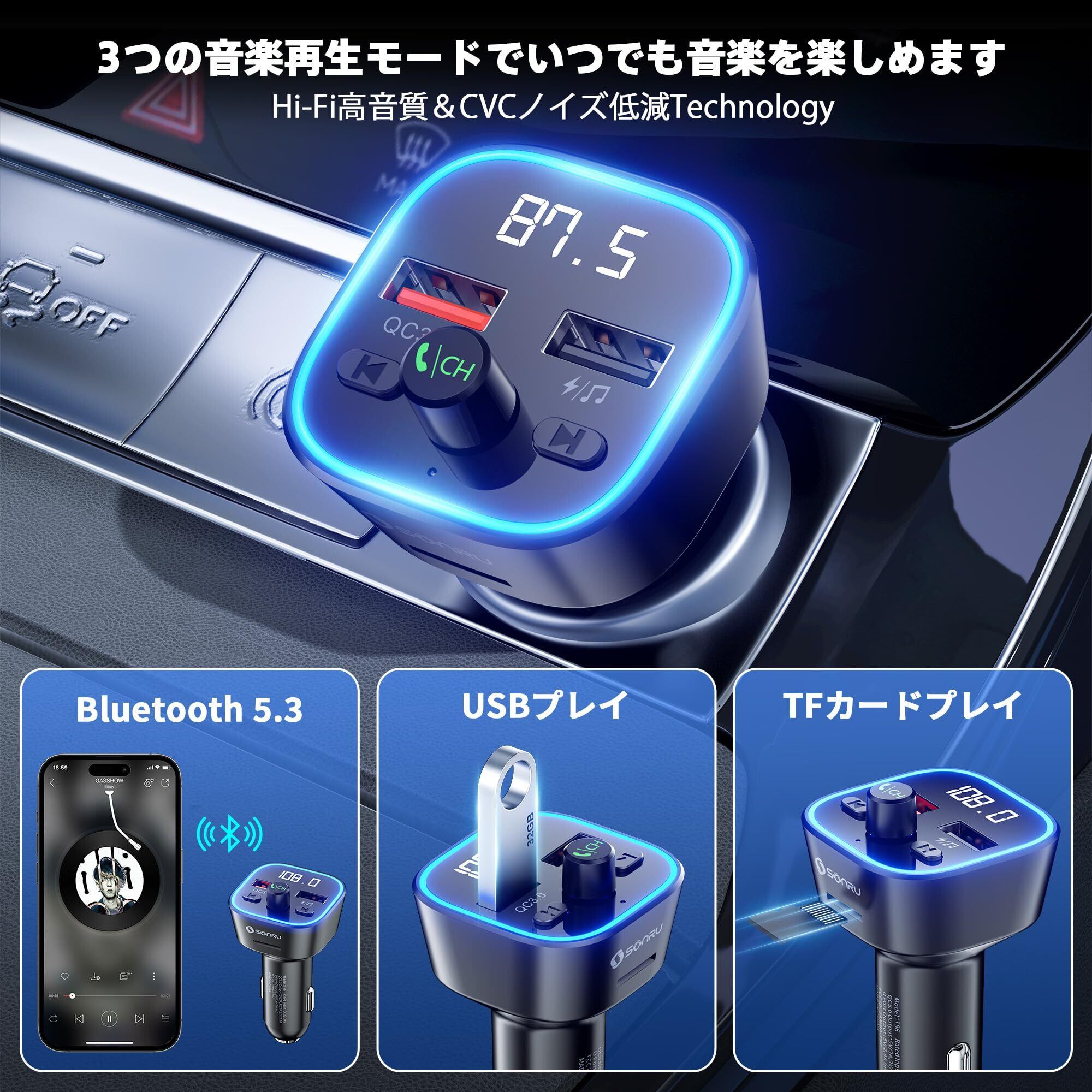【高音質音楽再生丨CVC騒音低減技術】トランスミッターはBluetooth、USBメモリーという2つ音楽再生モードがあり、CVCノイズ低減技術により外部ノイズを90%除去し、内蔵の高感度マイクで音源を再生することができる。運転中はクリアなハンズフリー通話と高音質音楽を楽しむことができます.