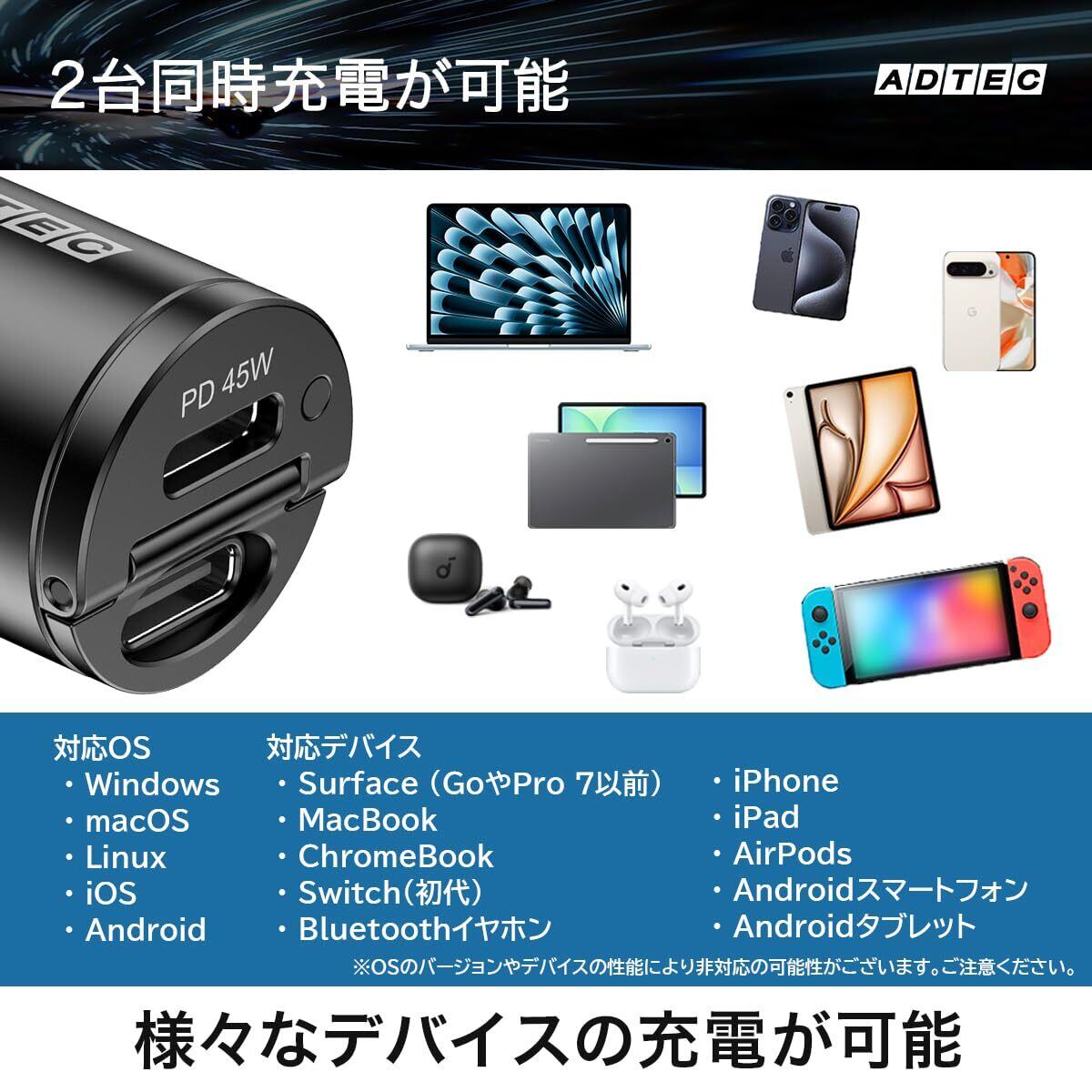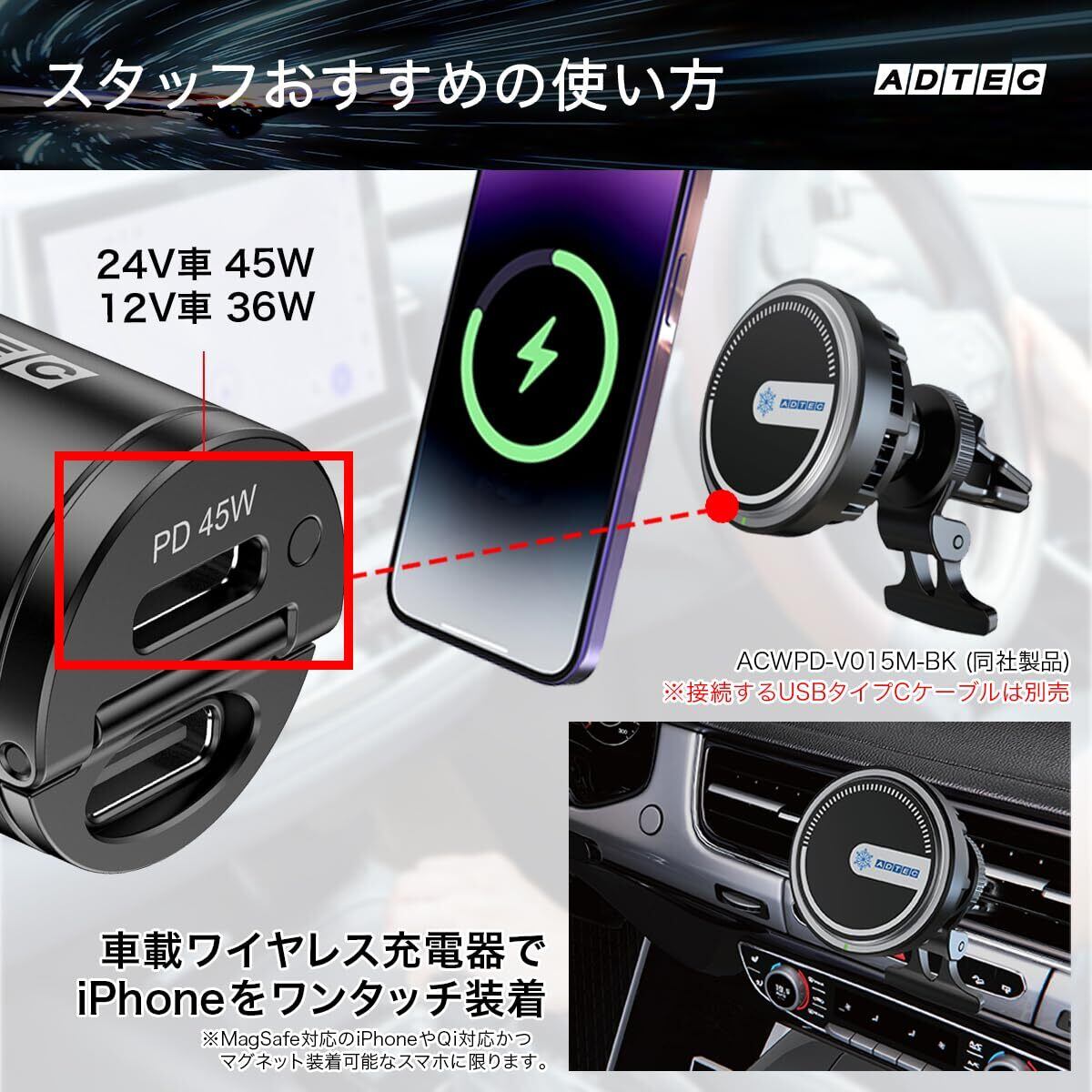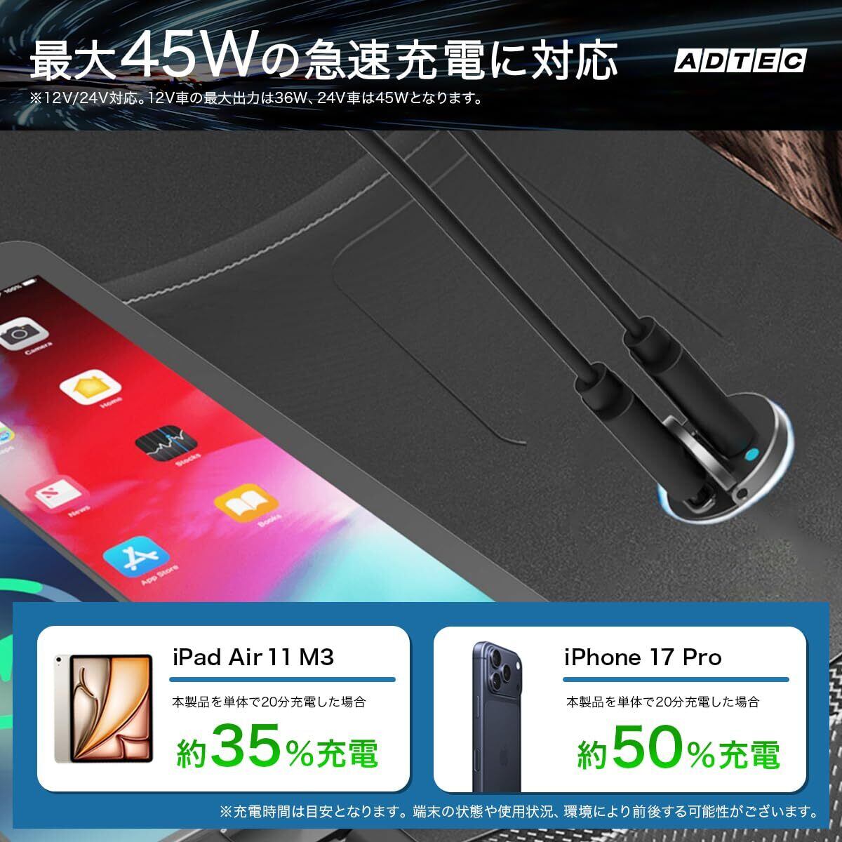 アドテック カーチャージャー 45W 超小型 ツライチ シガーソケット PD対応 PPS対応 急速充電 高速充電 36W出力 12V車対応 24V車対応 トラック 蓋が閉まる 車載充電器 iPhone 17 Air iPad Android タブレット ノートパソコン スマートフォン Switch Type-C 軽量 コンパクト ブラック ACPD-V045C2