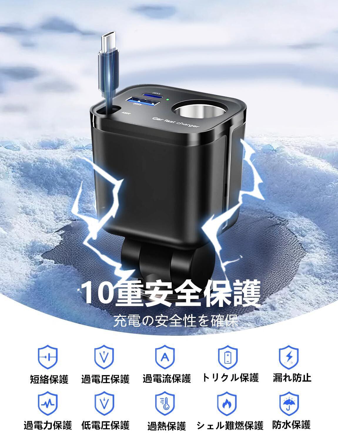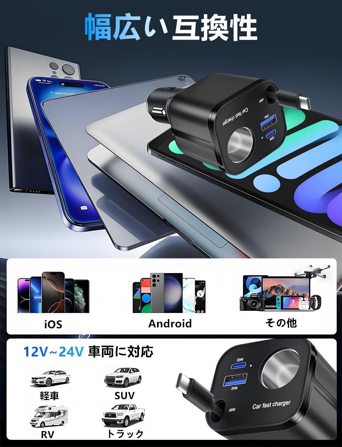 シガーソケット 増設巻き取り式充電ケーブル 車 充電器 シガーソケット 4台同時 車載 カー用品 10重安全保護 しがーソケット USB C カーチャージャー 1秒で収縮 角度調整 出張·旅行·通勤 車 便利グッズ 12-24V車用品 iOS/Android/PC/GPS/ゲーム機などの車 ソケット 分配器