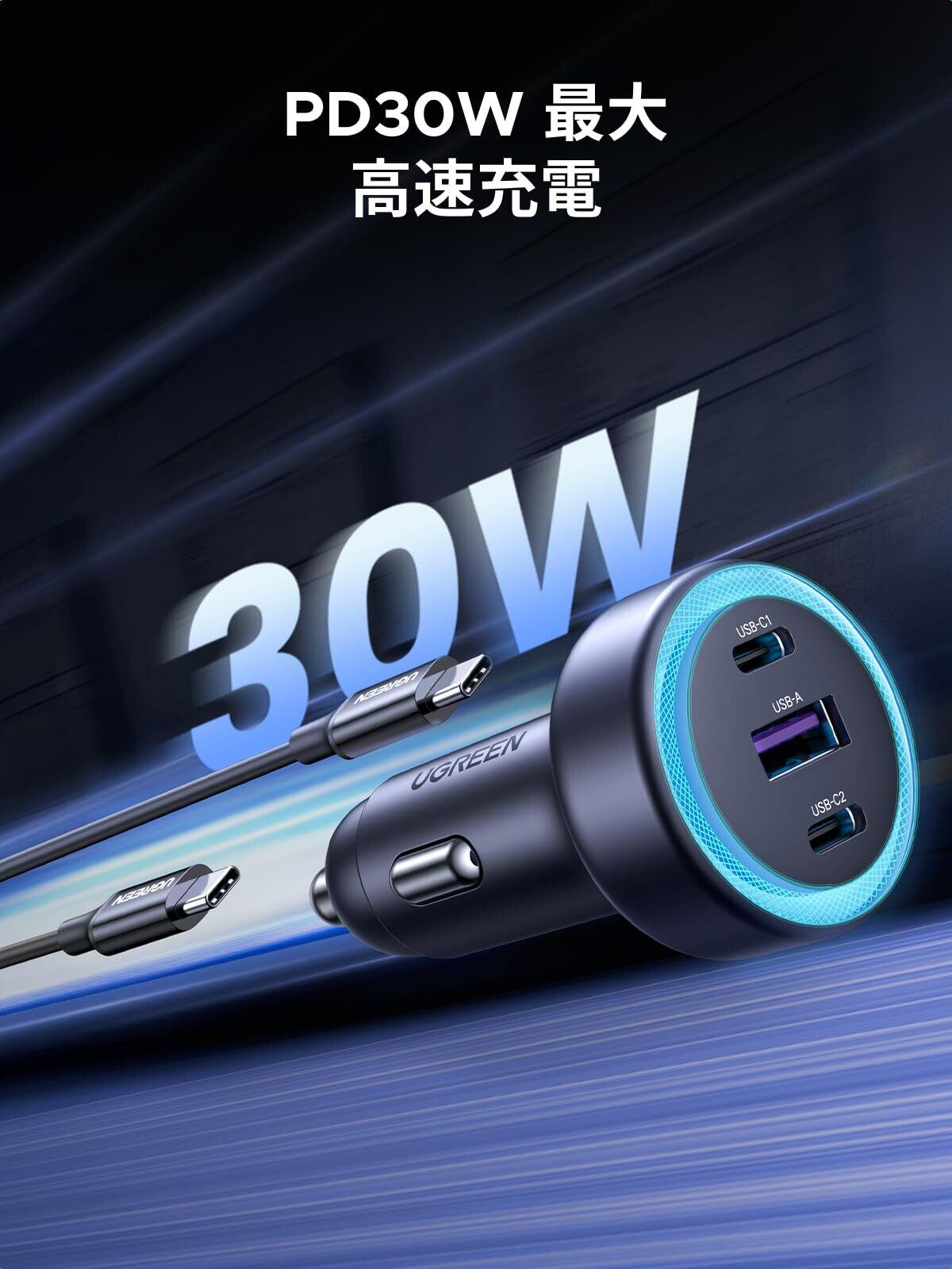 UGREEN 30W 2C1A シガーソケット usb-c カーチャージャー LED付き 3ポートPD3.0/QC4.0/PPS対応 車載充電器 コンパクトサイズ 耐久性 シガーソケット 急速充電器iphone17/13/12, Galaxy S22/S21 Ultra, iPad, MacBook,ラップトップなどに対応