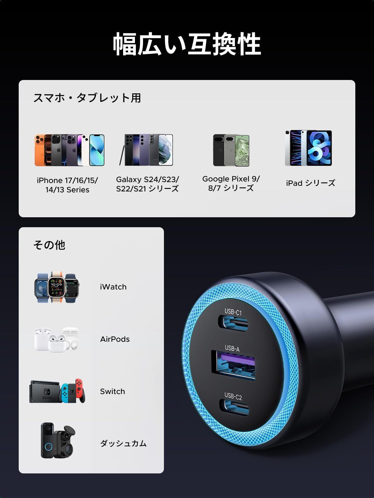 【USB-C二つ・USB-A一つ搭載!同時に利用可能】USB-C*2・USB-A*1の3ポートを備え、車内でも自宅と同じように気軽に充電可能!最大3つのスマホへ同時充電と、最大1つのスマホへ30W急速充電に対応で、楽々!2台同時に充電する場合は、総合出力が下がることをご了承ください。