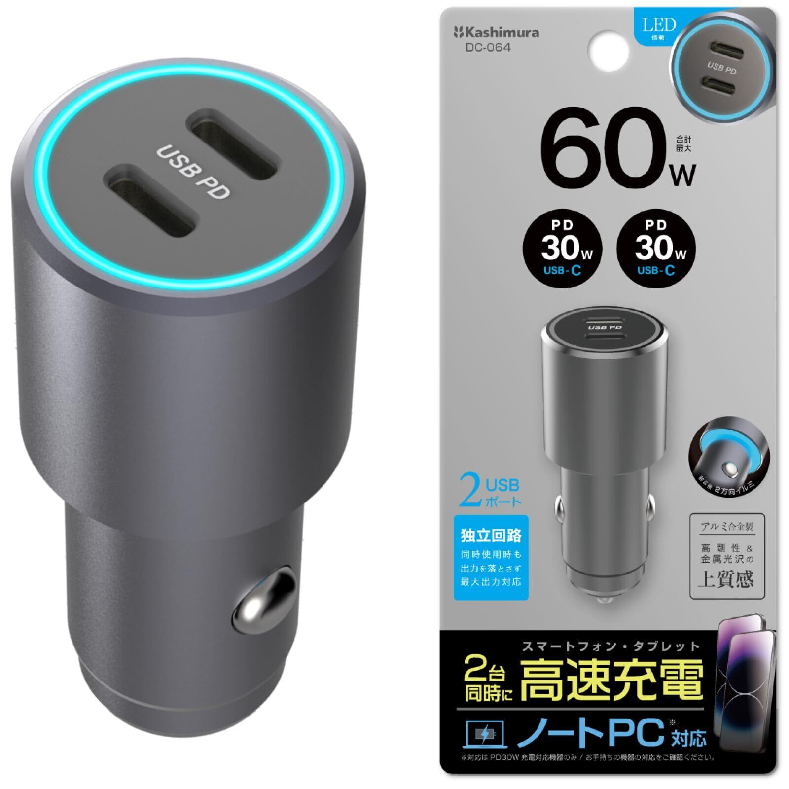 カシムラ(Kashimura) PD搭載カーチャージャー PD30W 2ポート合計60W ソケット周りを鮮やかに照らす イルミライト搭載 iPhone/Android各種対応 NDC-064