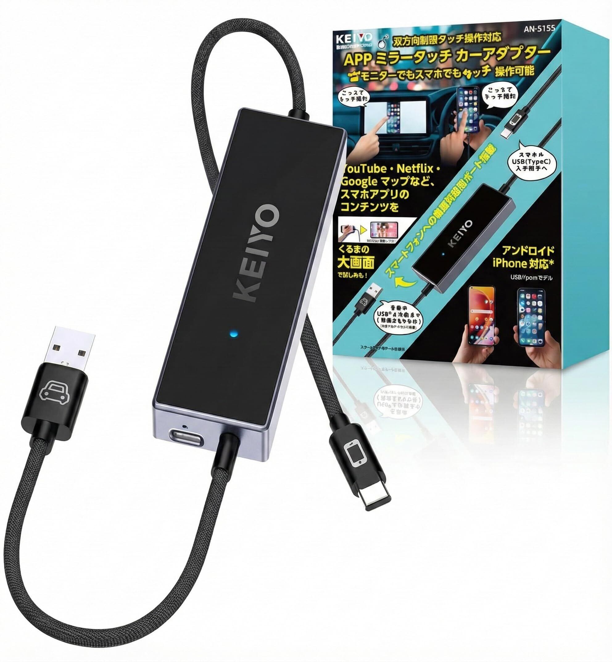 ケイヨウミラータッチカーアダプター 車載ミラーリング iPhone/Android対応 有線Car Play搭載車両専用 DisplayPort対応スマホ画面を車載ディスプレイに表示 タッチ操作可能 27W PD充電 USB-A/C変換アダプター付属 日本人による丁寧なサポートAN-S155 (ミラータッチカーアダプター)
