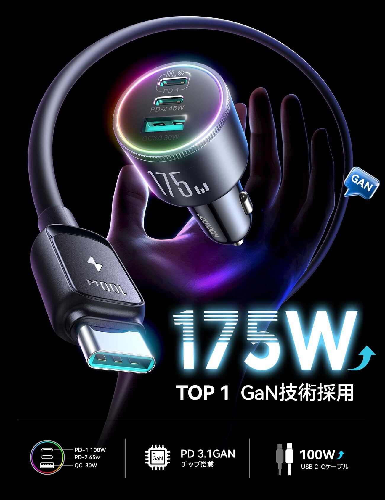 JOYROOM シガーソケット USB-C カーチャージャー 175W 3ポート独立3チップ設計 多重保護 車載充電器 ノートPC/パソコン/MacBook/iPhone/Android/など対応 (ブラック)