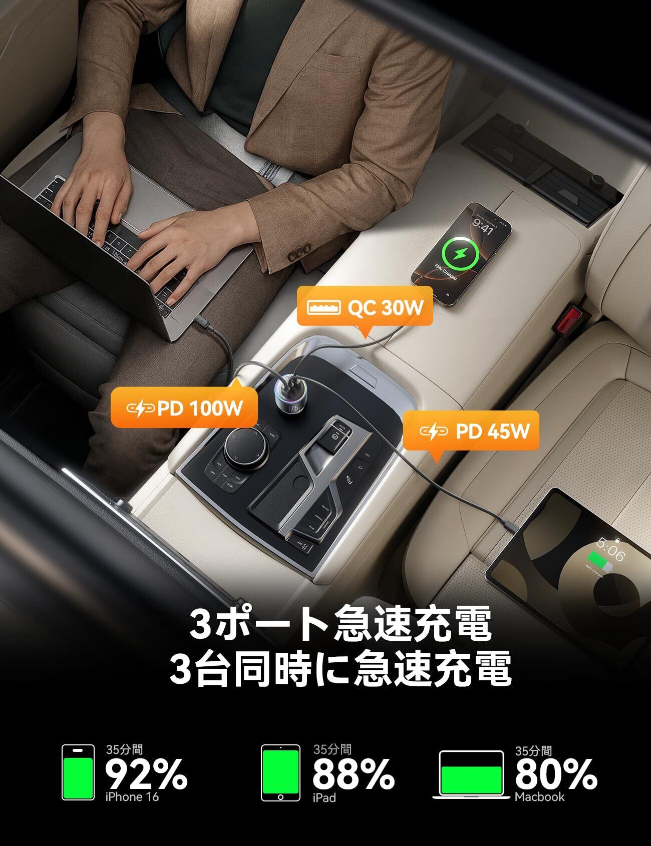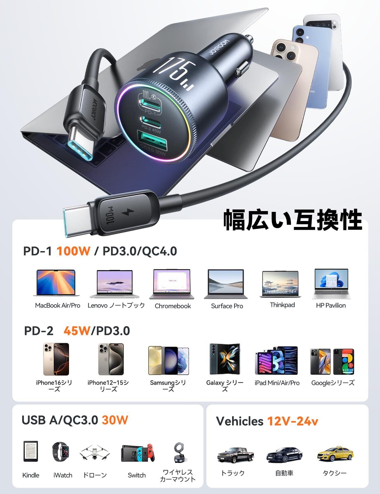 【幅広い互換性・あらゆる車種で使用可能】 - 本製品はシガーソケット(12V/24V)に対応しており、乗用車からトラックまで幅広い車種で使用可能です。MacBook、iPhoneシリーズ、Galaxyシリーズ、Google Pixel、Kindleなど、あらゆるデバイスをこの1台でカバーです。耐久性にもこだわり、3000回以上の抜き差しテストをクリアしました。