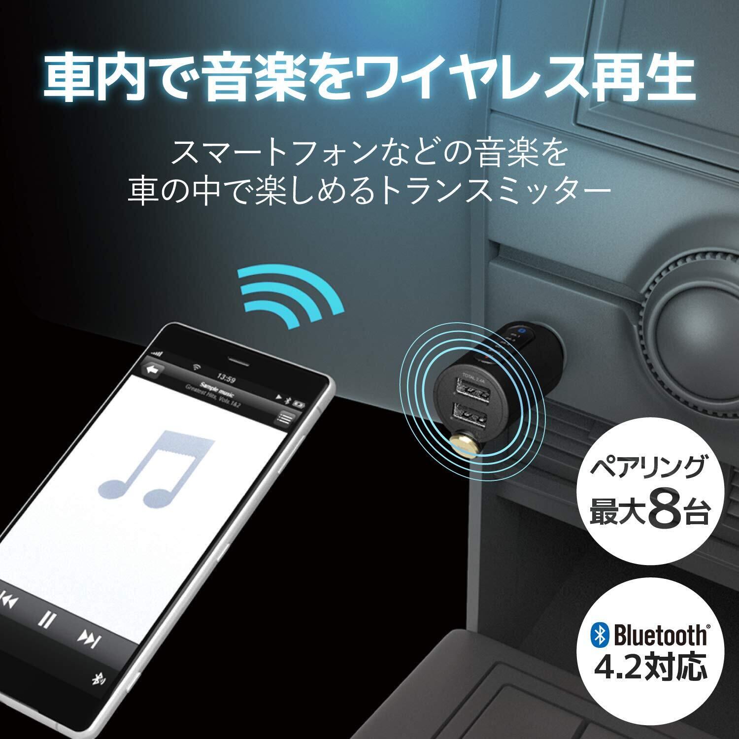 スマートフォンやタブレットの音楽を車の中でワイヤレスで楽しめるBluetooth(R)FMトランスミッターです。