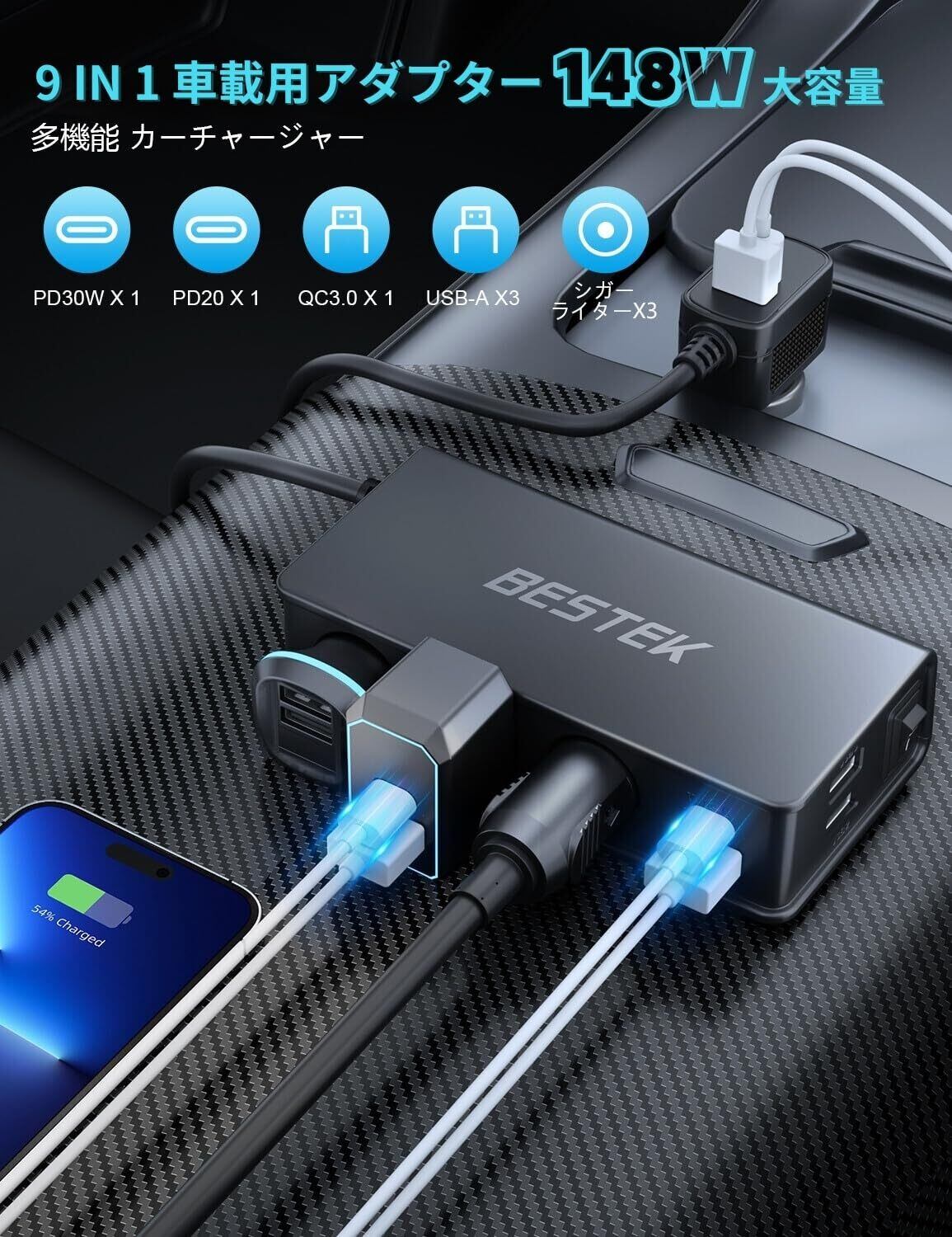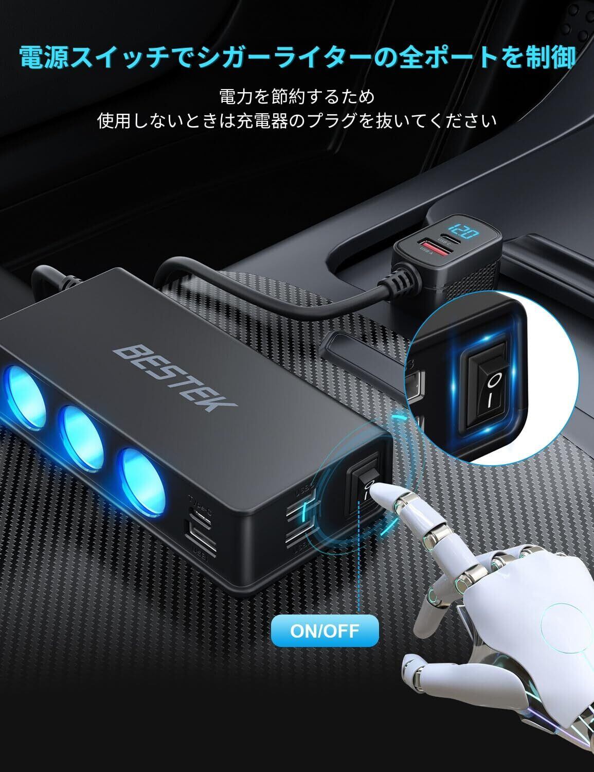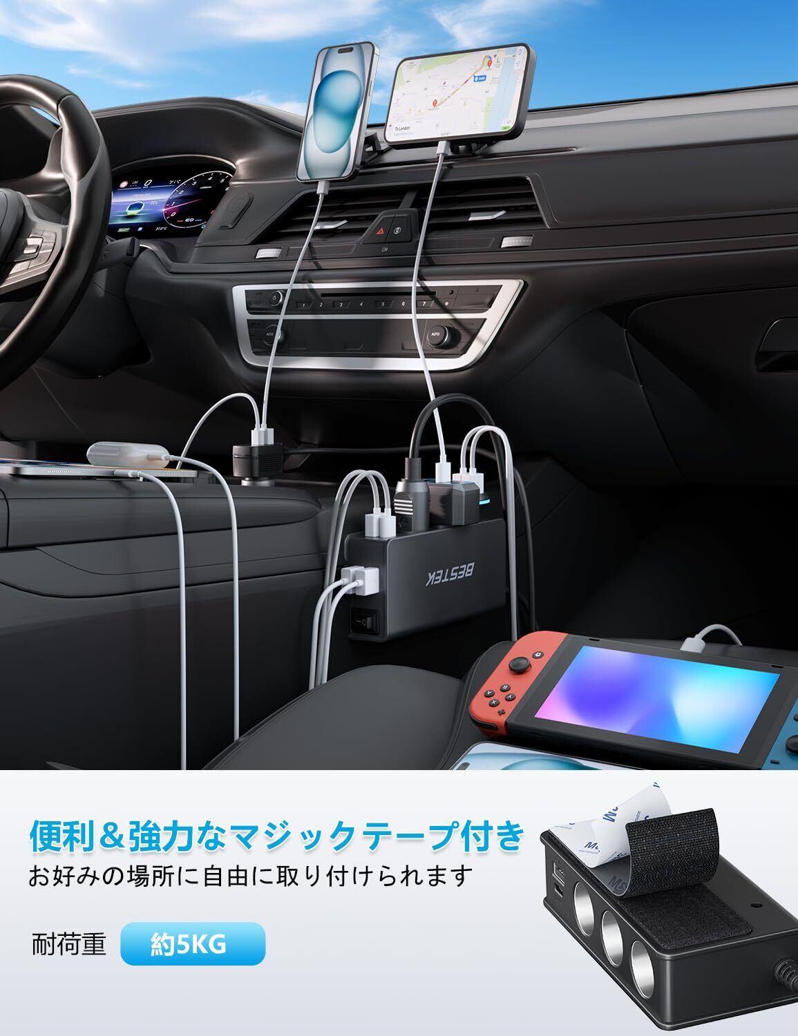 複数デバイスの同時充電: あなたはBESTEKシガーライター分配器を使って、1つのシガーライターから3つのソケットに拡張し、合計180Wまでの電力を使用できます。これにより、最大9台の機器を同時に充電でき、車内のアクセサリーを整理します。