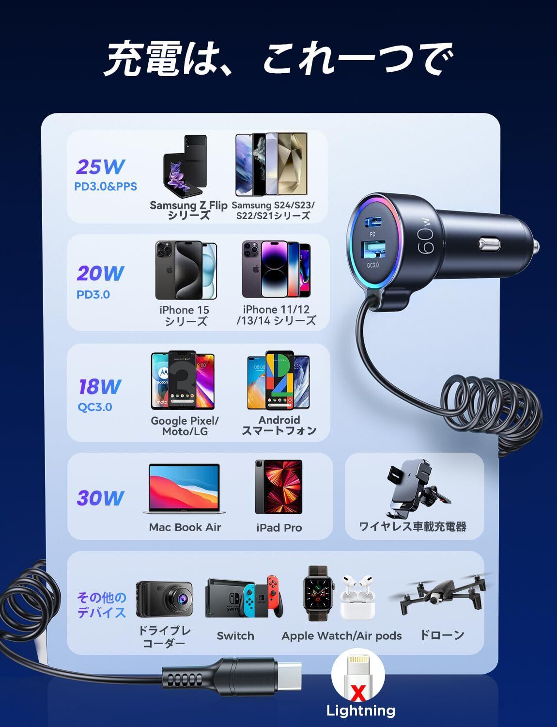 【 PD+QC3.0対応デュアルポート】タイプCコイルケーブルは最大36W、PD(タイプC)ポートは最大36W、QC3.0(USB A)ポートは最大18Wの出力を実現(PD+QC 3.0 Output:5V=4A(36W Max))。30分でiPhone 16を60%、またはAndroidデバイスを70%まで急速充電可能。シガーソケットUSB充電器の新しいスタンダードとして、充電のスピードと効率を革命的に向上させます。