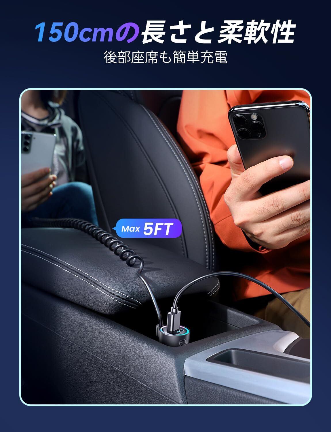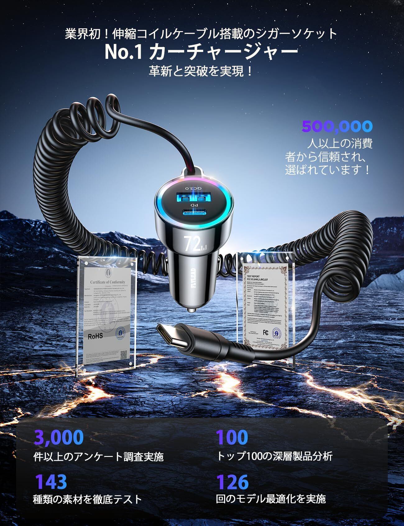 【 虹色LED&1.5MタイプCコイルケーブル付き】1.5mのタイプC急速充電コイルケーブルが標準装備され、別途購入の必要なし!夜間の運転時には、虹色LEDリングで電源状態を一目で確認できます。これにより、車内のデザイン性と使いやすさが完璧に融合した、視覚的にも魅力的な充電体験を提供します。
