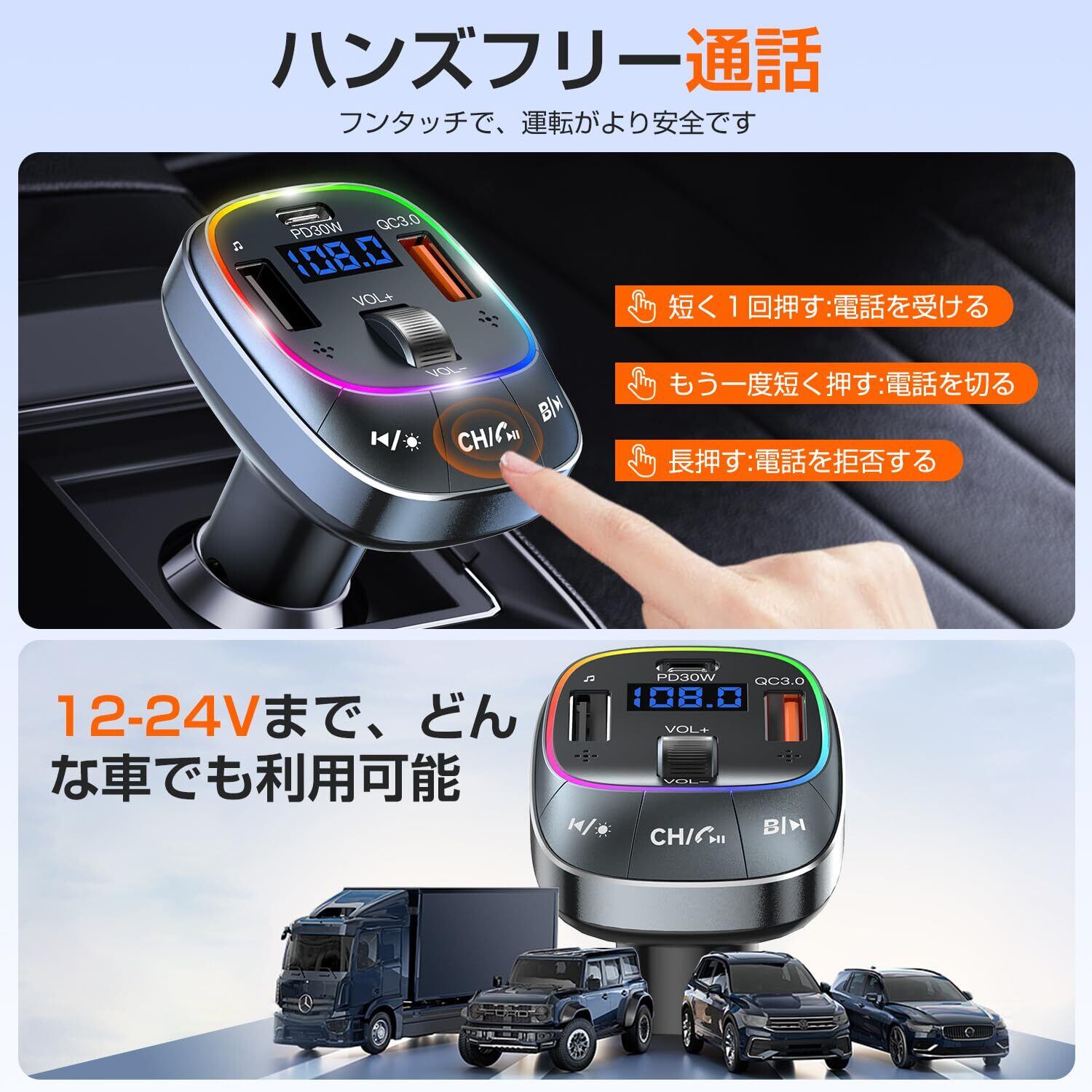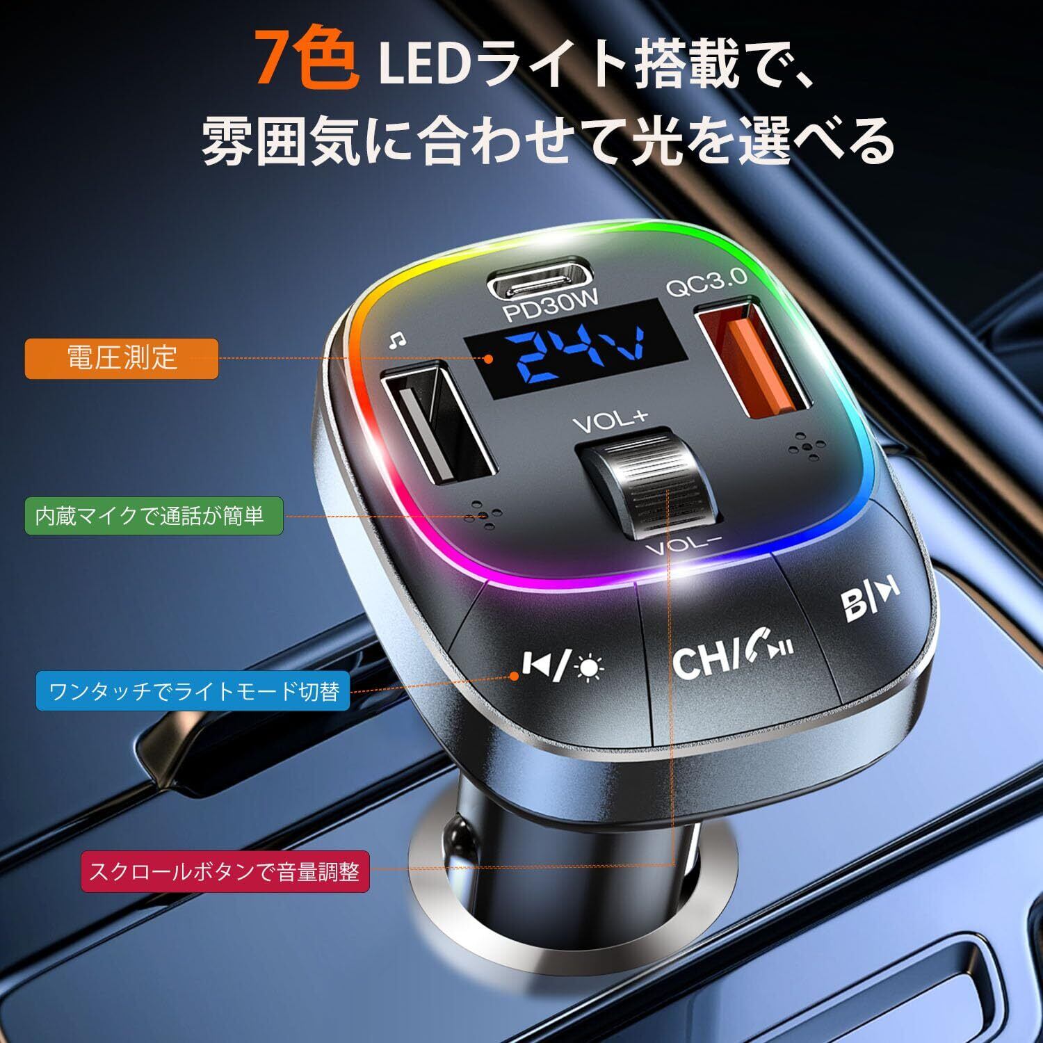 FMトランスミッター Bluetooth 5.3 デュアルマイク ノイズ軽減 音楽再生モード 車載充電器 3つポート USB&Type-C QC3.0急速充電 PD30W対応 12V/24V車対応 ハンズフリー通話 7色LEDライト シガーソケット USBメモリ