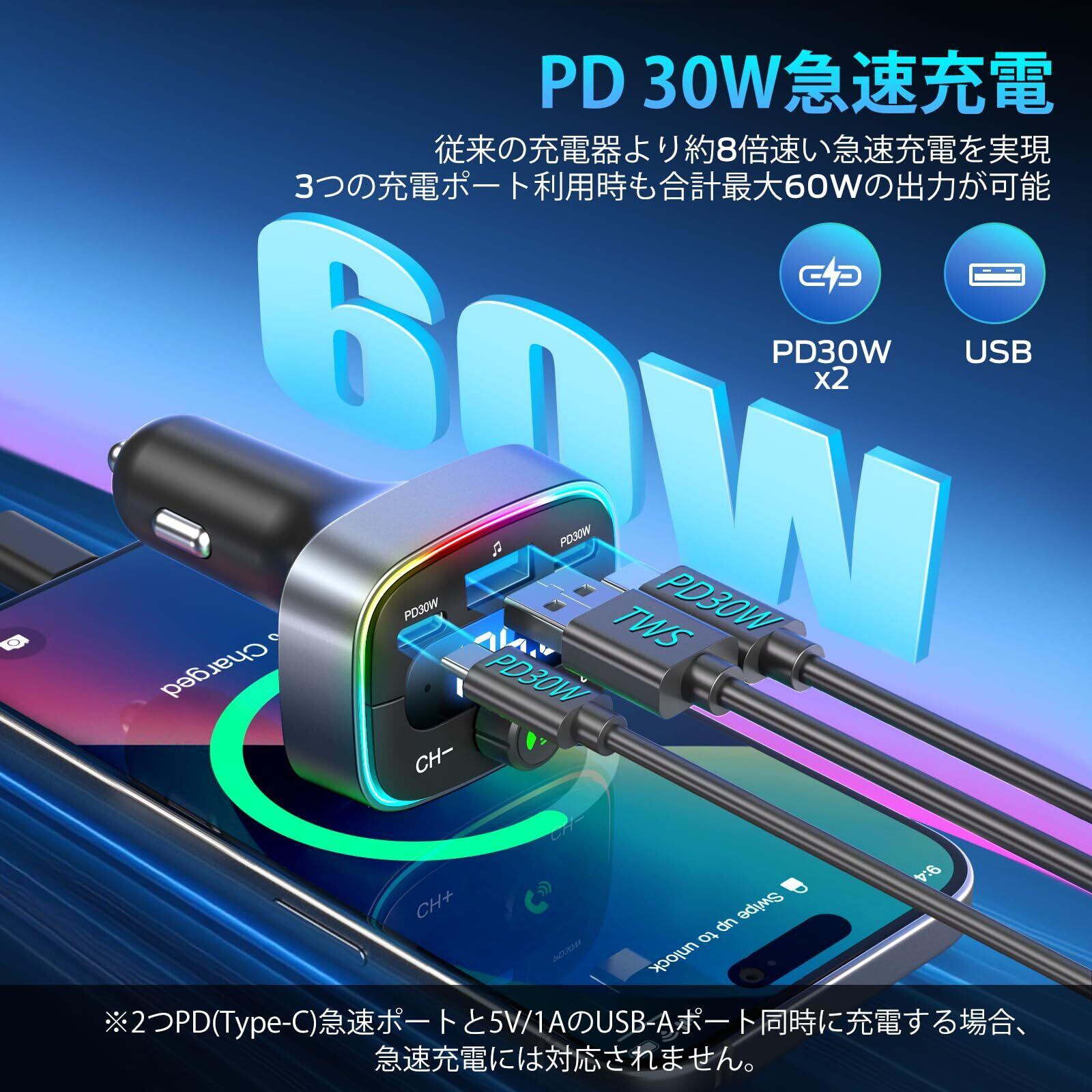 【業界最新Bluetooth5.4&PD 30W急速充電丨3台同時充電】:この車載FMトランスミッターは業界最新のBluetooth5.4を搭載し、よりも安定した高速接続を提供できます。Bluetooth5.4 FMトランスミッターの通信速度は8倍で、転送遅延と接続エラーの問題を最適化します。一度、Bluetoothペアリングを行った場合、二回目以降はエンジンをONにすると自動で再接続ます。2つPD 30W(Type-C)高速ポートは、従来の充電器より約8倍速い急速充電を実現することができます。2つのType-Cポートに加えて、5V/1AのUSB-Aポートも搭載しています。同時に3台のデバイスを充電でき、移動中でも複数デバイスの電池不足を解消できる。※2つPD(Type-C)急速ポートと5V/1AのUSB-Aポート同時に充電する場合、急速充電には対応されません。