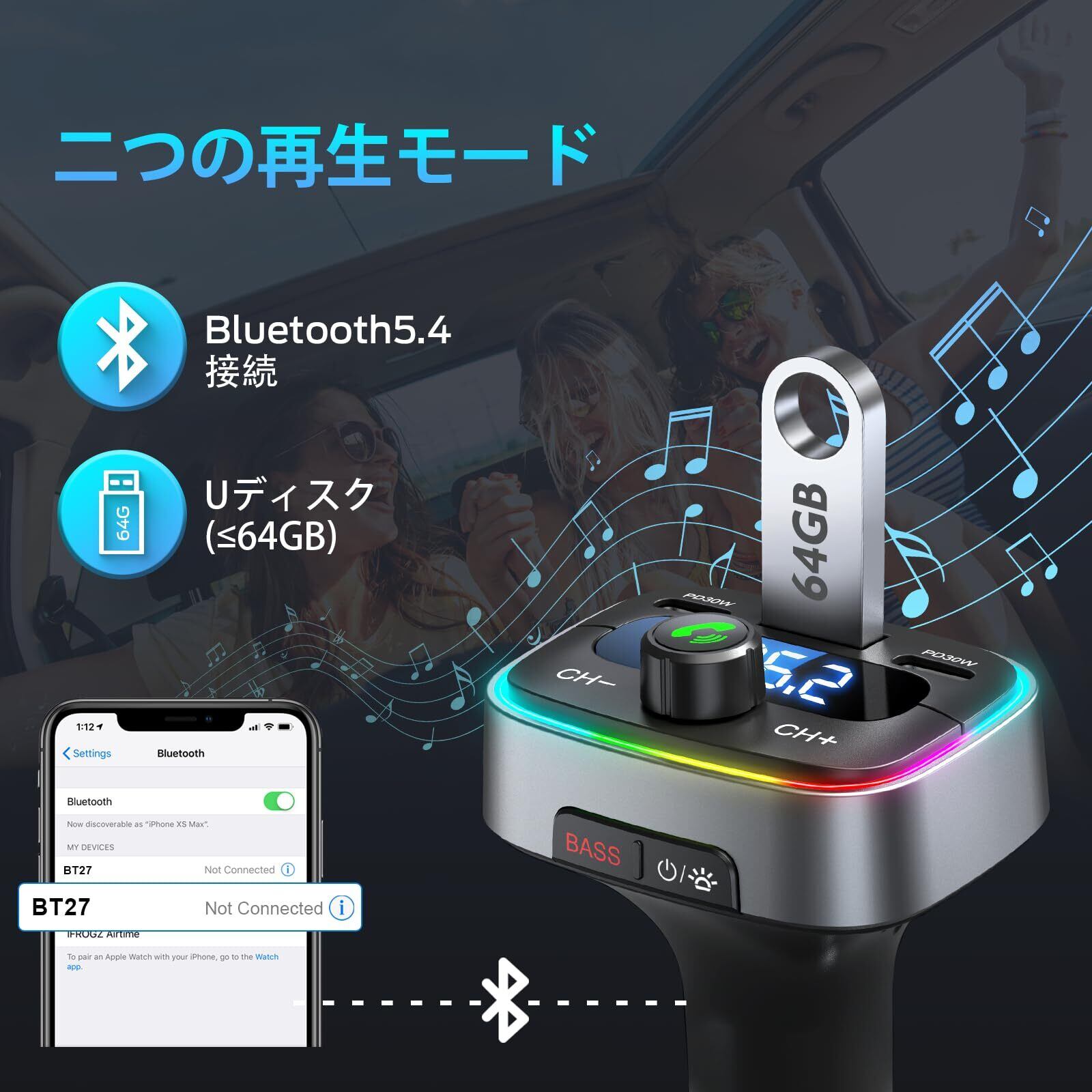 【二つの音楽再生モード&重低音ブースト機能】二つの再生モード: ①Bluetooth5.4無線接続(各種Android、Appleの全てのBluetoothデバイスに対応) ②Uディスク(≤64GB)に記録したデータを車内でお聴き頂けます。BT27 FMトランスミッターは重低音ブースト機能が搭載されているので、ワンプッシュだけで深みのある低音再生とオープンイヤーリスニング体験で運転を盛り上げましょう。