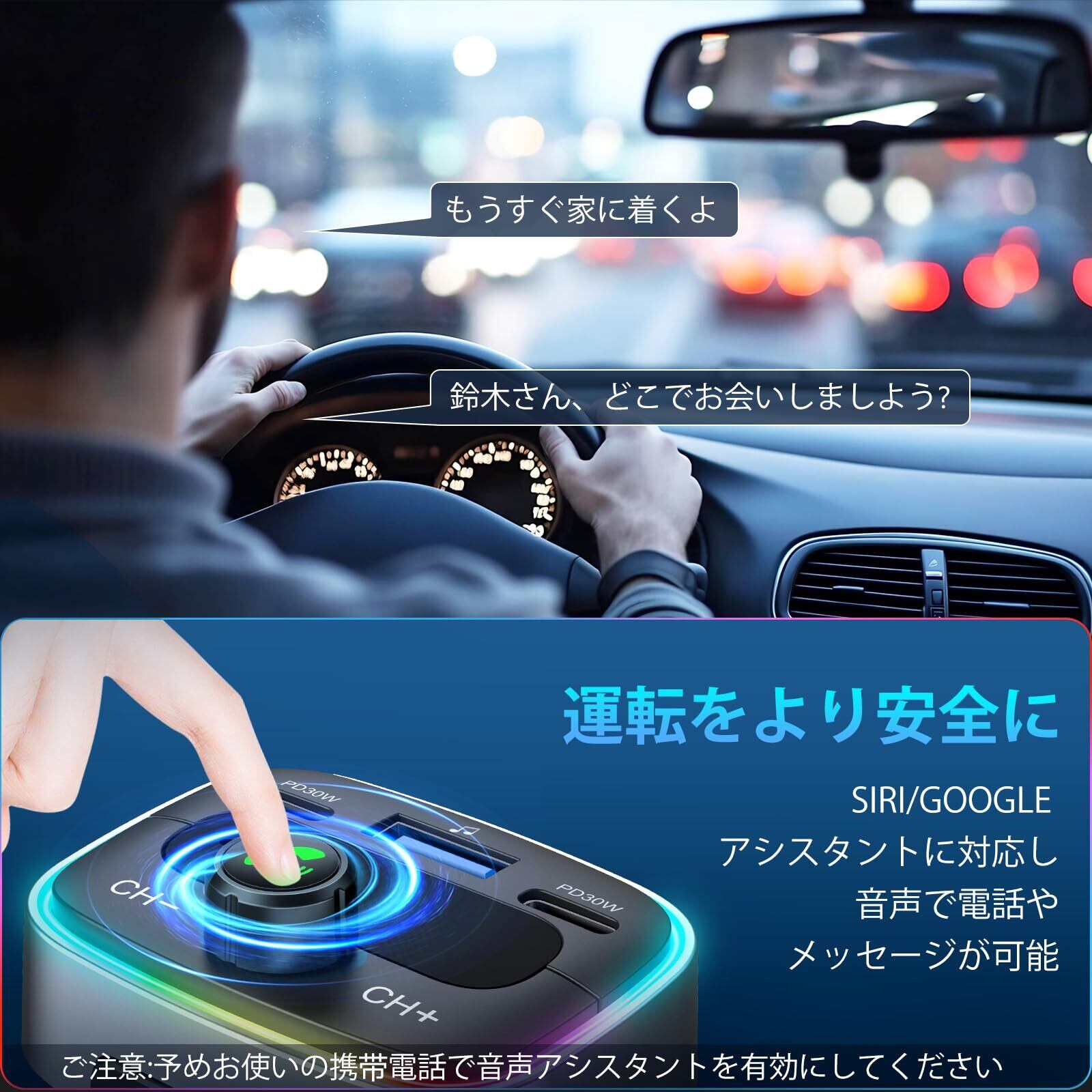 FMトランスミッター HUNDRUP 車載FMトランスミッター PD 30W急速充電 車載充電器 3つポート USB *1口&Type-C *2口 Bluetooth/Uディスク対応 重低音モード Siri&Google Assistant対応 ハンズフリー通話 7色LEDライト12V-24V車対応 電圧測定 日本語説明書 BT27