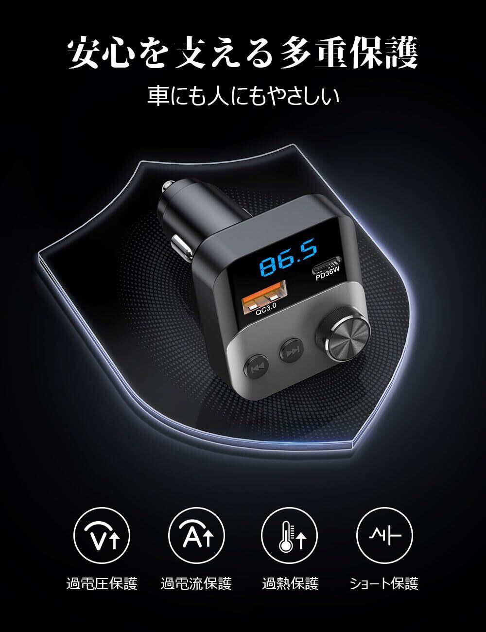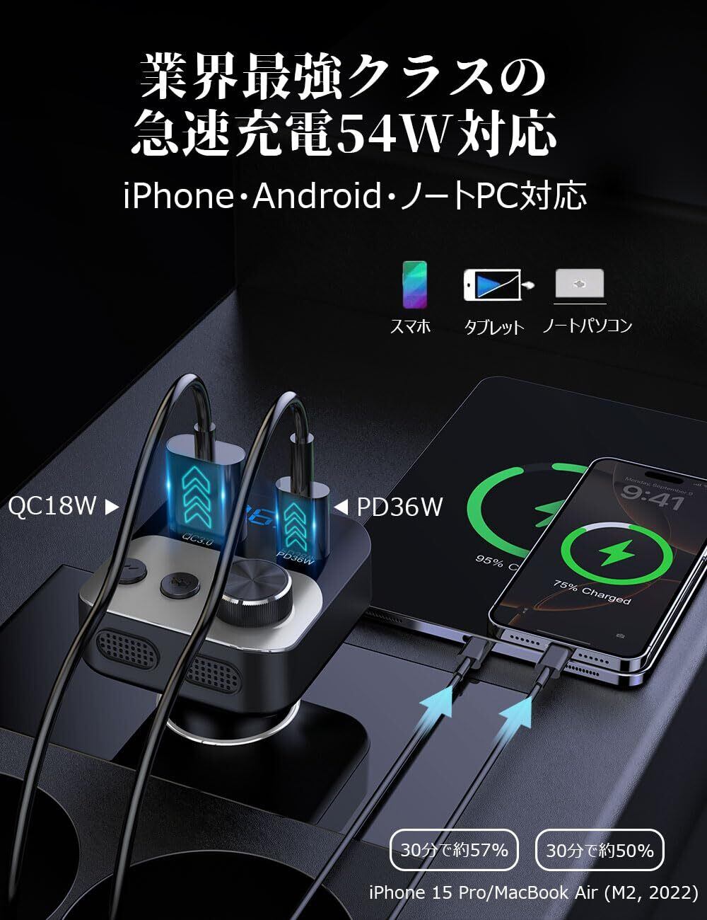【業界最強クラスの急速充電54W対応】PD3.0ポート(最大36W)+QC3.0ポート(最大18W)の2ポート搭載カーチャージャー。iPhoneやAndroidスマホはもちろん、タブレットや軽量ノートPCまで幅広く対応し、走行中も快適に超高速充電。シガーソケットに挿すだけで、FMトランスミッターとしての便利さも一台に集約。ドライブ中もバッテリー残量の心配なし。