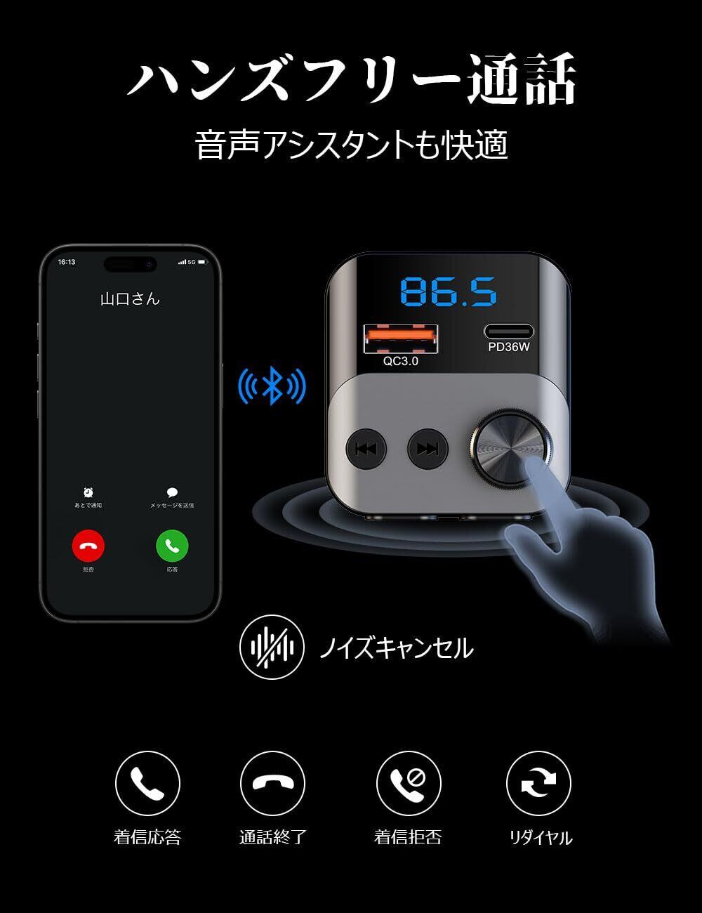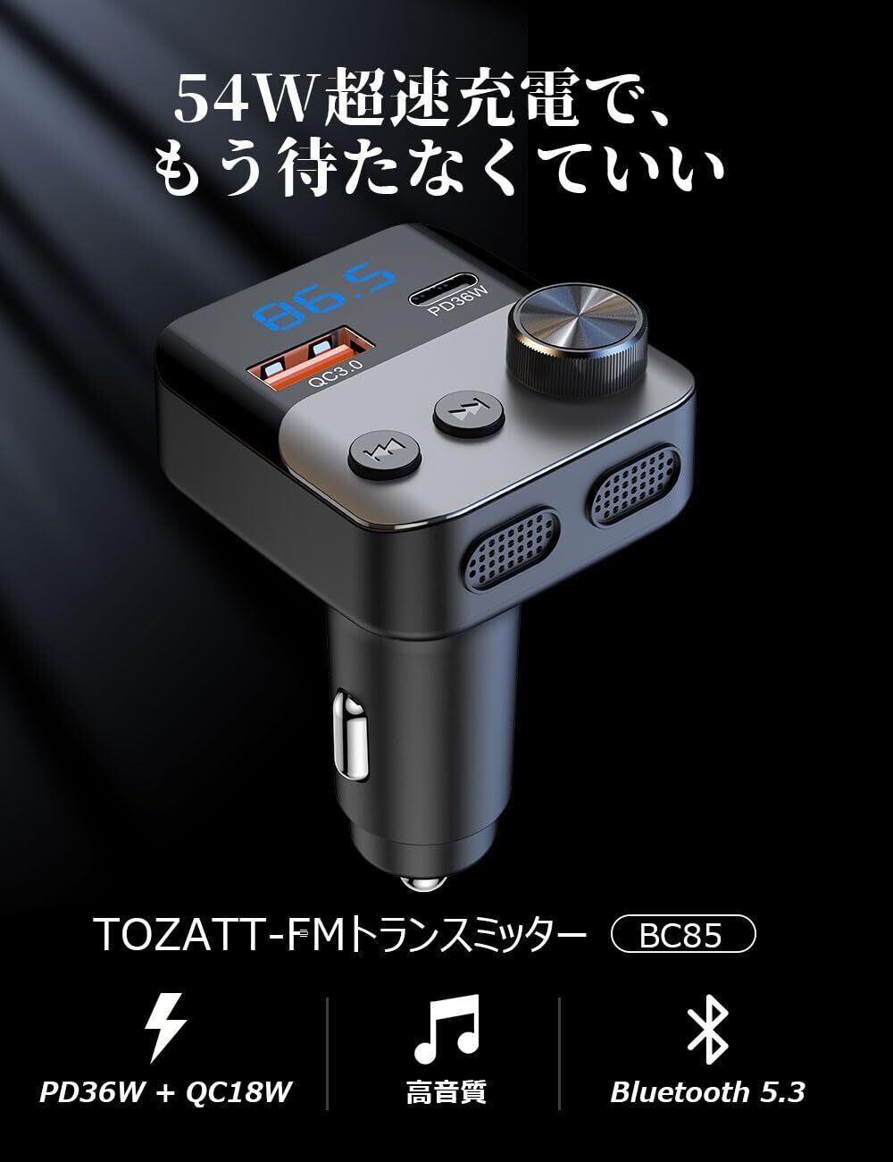 TOZATT FMトランスミッター Bluetooth 車載 ハンズフリー通話 QC3.0/PD3.0対応 カーチャージャー シガーソケット 12V/24V対応