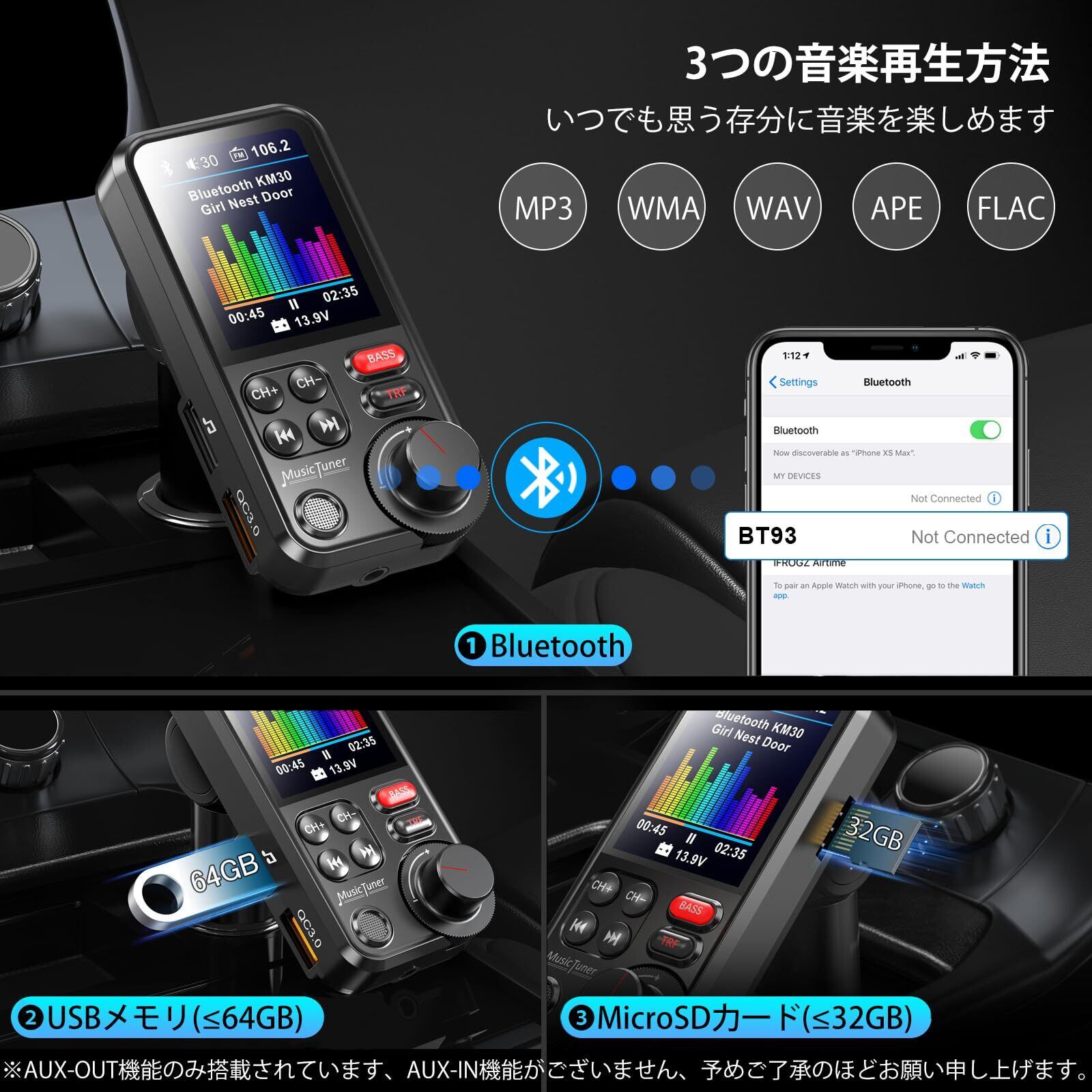 【音楽再生の三重モード&ハンズフリー通話】:①Bluetooth 5.0ワイヤレス接続:AndroidやAppleなどの各種デバイスと互換性があります。②USBメモリー:最大64GBまでのUSBストレージに対応しています。③microSDカード:最大32GBまでのmicroSDカードに対応しています。※高音質AUX接続:さらに、付属のAUXケーブルを使って、本FMトランスミッターのAUX端子と車載オーディオのAUX端子を接続することで、より高音質で音楽を楽しむことができます。回転ダイヤルを装備しており、着信応答/拒否/リダイヤルなどの操作をワンボタンで完了できます。電子機器の操作が苦手な方でも簡単に使いこなせる設計です。