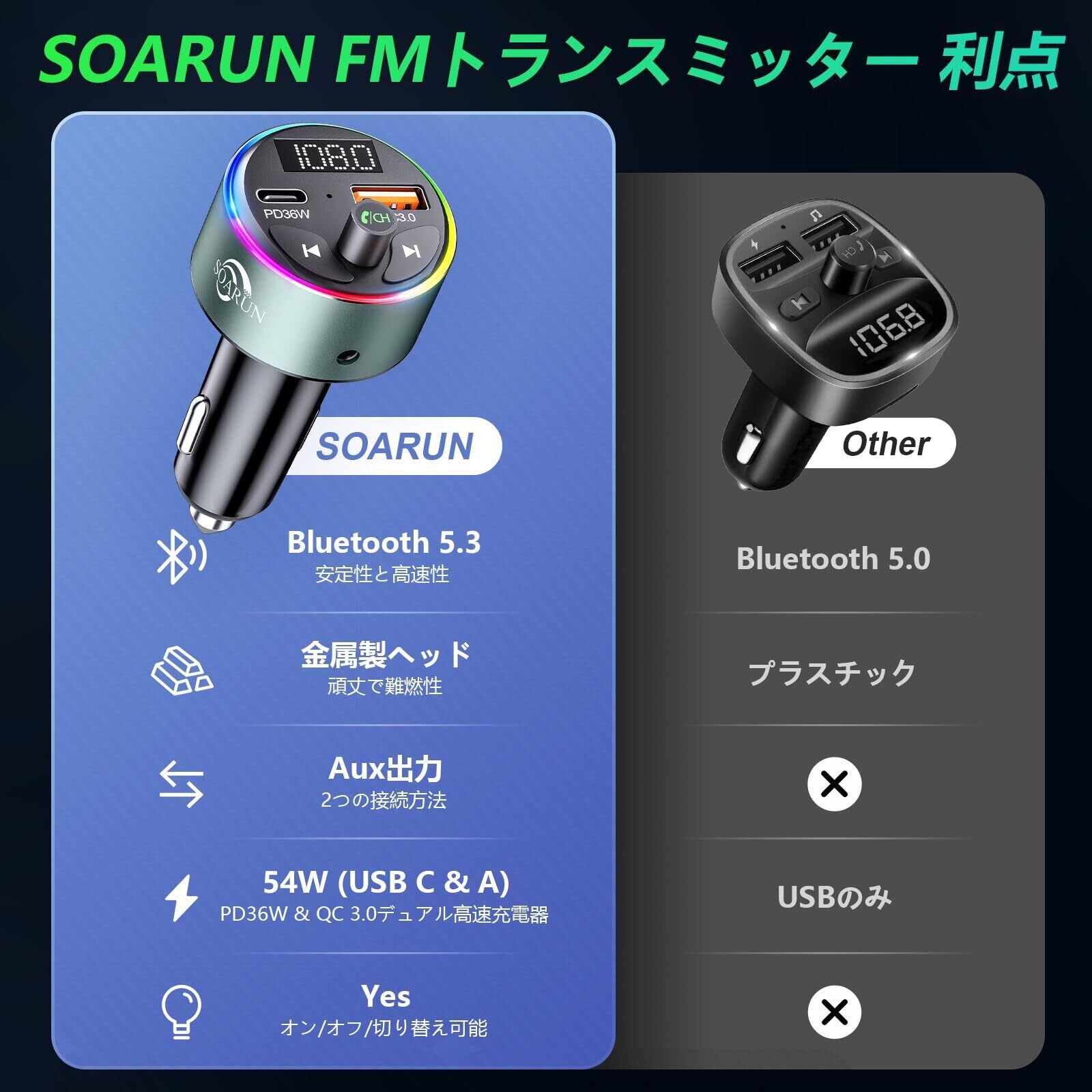 SOARUN FMトランスミッター Bluetooth 5.3 車載充電器 車載Bluetoothトランスミッター PD36W+QC3.0 急速充電 2ポート FMカーチャージャー Siri&Google Assistant対応 ハンズフリー通話 9RGBバックライト LEDライト シガーライターソケット AUX入力 音楽再生12V/24V車対応