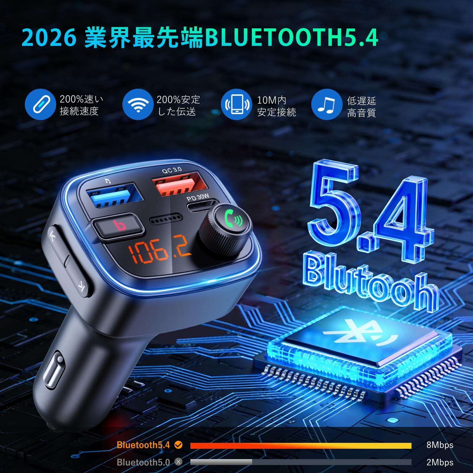 【最新Bluetooth5.4&QC3.0+PD 30W急速充電丨3台同時充電】:本製品は最新のBluetooth 5.4チップを採用し、より安定した高速接続を実現しました。従来のモデルと比較して伝送速度が8倍に向上。通信の遅延や接続不良といった問題を効果的に解決しています。一度ペアリング設定を行えば、次回からはエンジンを始動するだけで自動的に再接続されます。PD 30W(Type-C)とQC3.0(USB-A)の2種類の急速充電ポートを搭載。従来の充電器よりも約8倍速い急速充電が可能です。さらに、5V/1AのUSB-Aポートも備えており、最大3台のデバイスを同時充電できます。移動中のバッテリー切れの心配をこれ一台で解消します。※最大合計出力:48W。