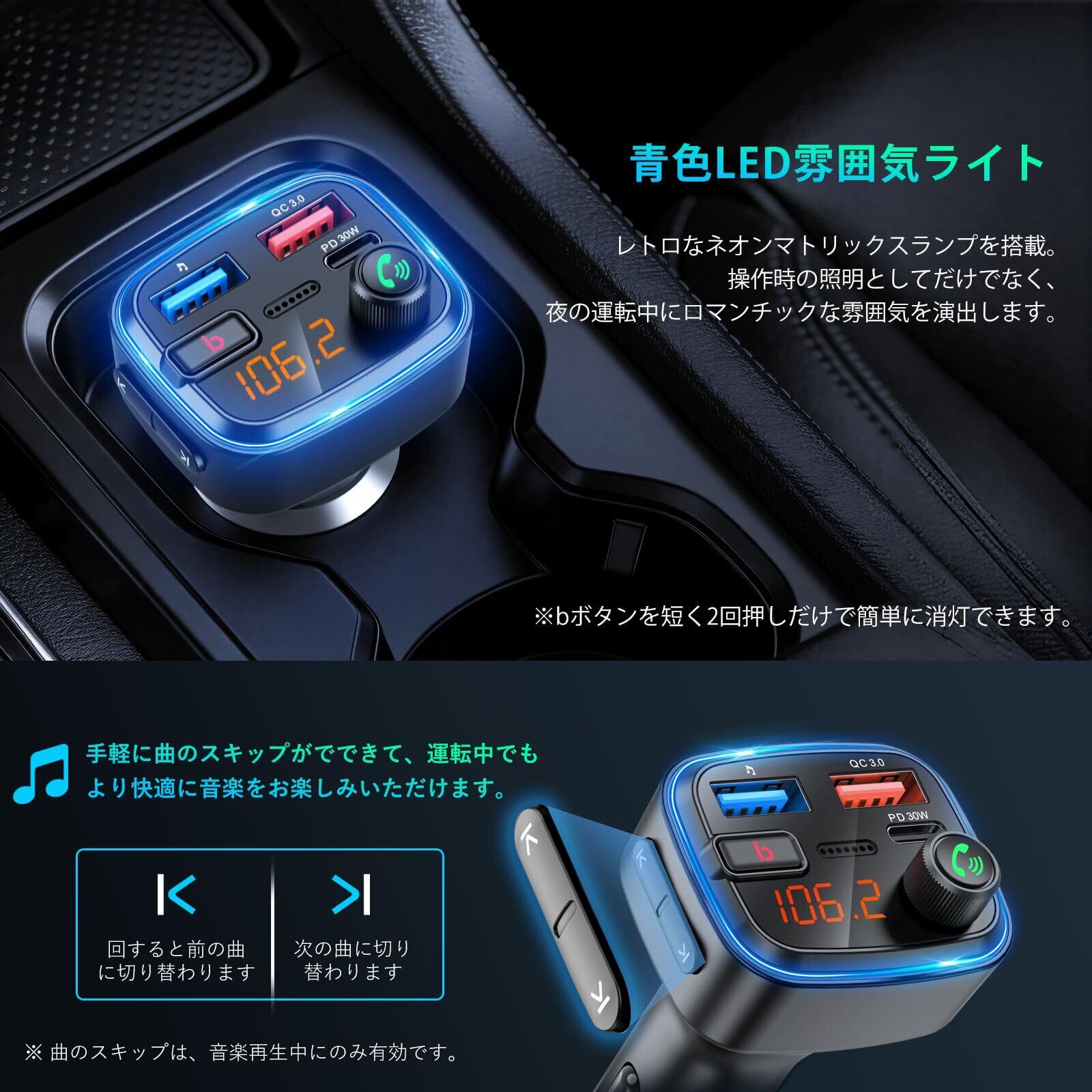 FMトランスミッター HUNDRUP 車載FMトランスミッター QC3.0急速充電 PD30W 急速充電 3つポート USB *2口&Type-C *1口 2つの音楽再生モード Bluetooth/USBメモリ対応 重低音モード Siri&Google Assistant対応 ハンズフリー通話 12V-24V車対応 7色LEDライト バッテリー電圧測定 日本語説明書 C88