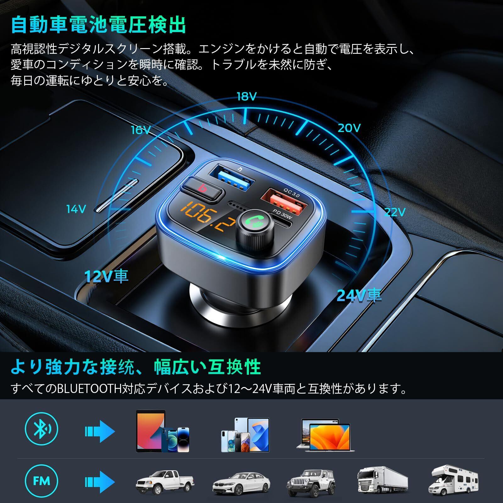 【電圧測定・12ヶ月安心】:本FMトランスミッターは車のソケットに挿し込むとバッテリーの電圧を自動検知し、ディスプレイに表示します。12~24Vの入力、周波数87.5-108Mhz、一般車種12V、トラック24Vまですべての車種に対応しています。同時に、この車用Bluetoothトランスミッターは、iPad、iPhone、Samsung、Google、LG、HTCなどと互換性があります。※電波法認証取得 (番号204-B00910 ) "微弱無線" 検査合格。お客様は安心にご利用頂けます。購入後12ヶ月間のアフターサービスを提供いたします。何かご不明な点がございましたら、[アカウントサービス]‐[注文履歴]‐[出品者に連絡する] の方でお気軽にご連絡のほどお願いします。