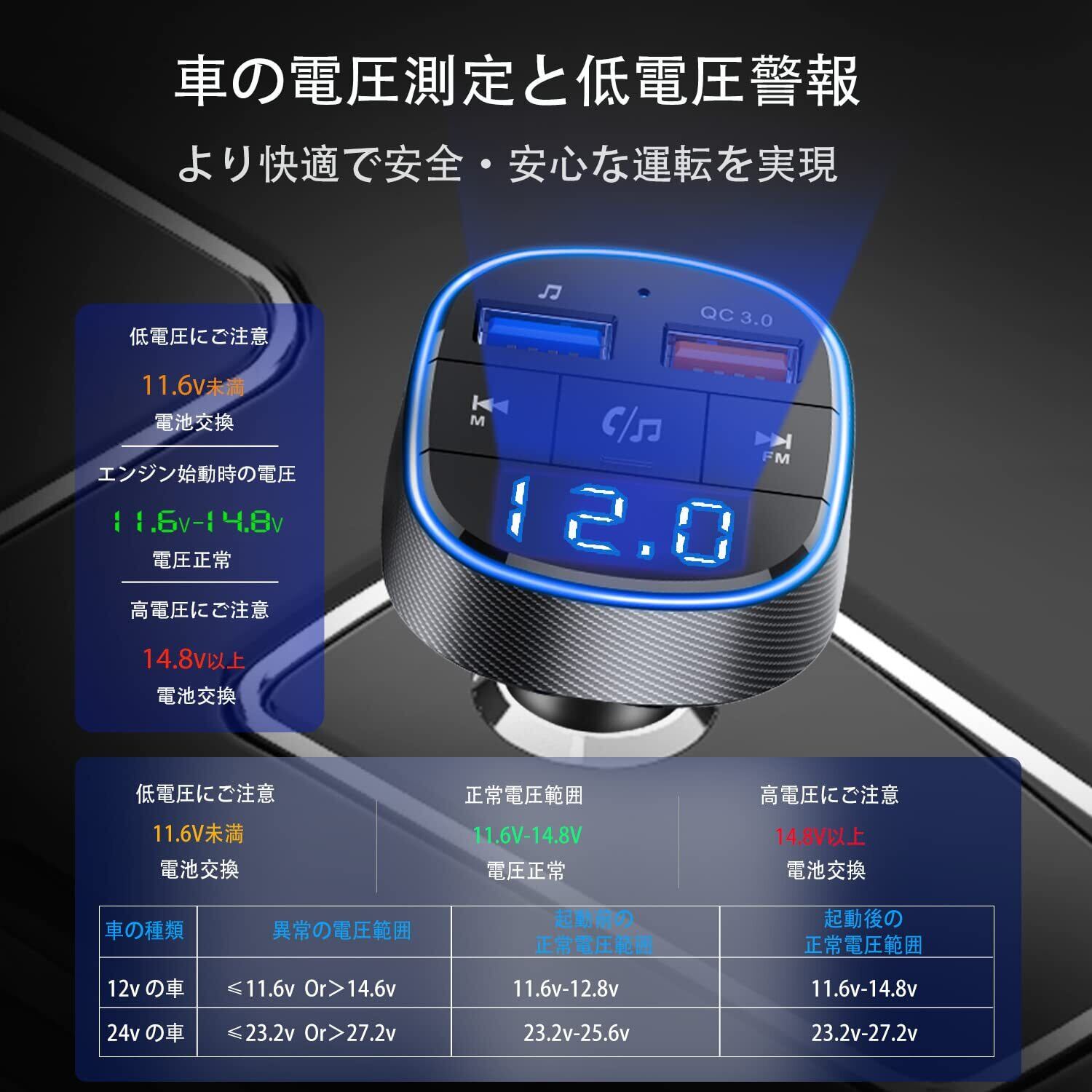 fmトランスミッター bluetooth5.3 QC3.0急速充電 ハンズフリー通話 Siri&Google Assistant対応 カーチャージャー 12~24V車対応 低電圧提示 日本現地にカスタマーサービス