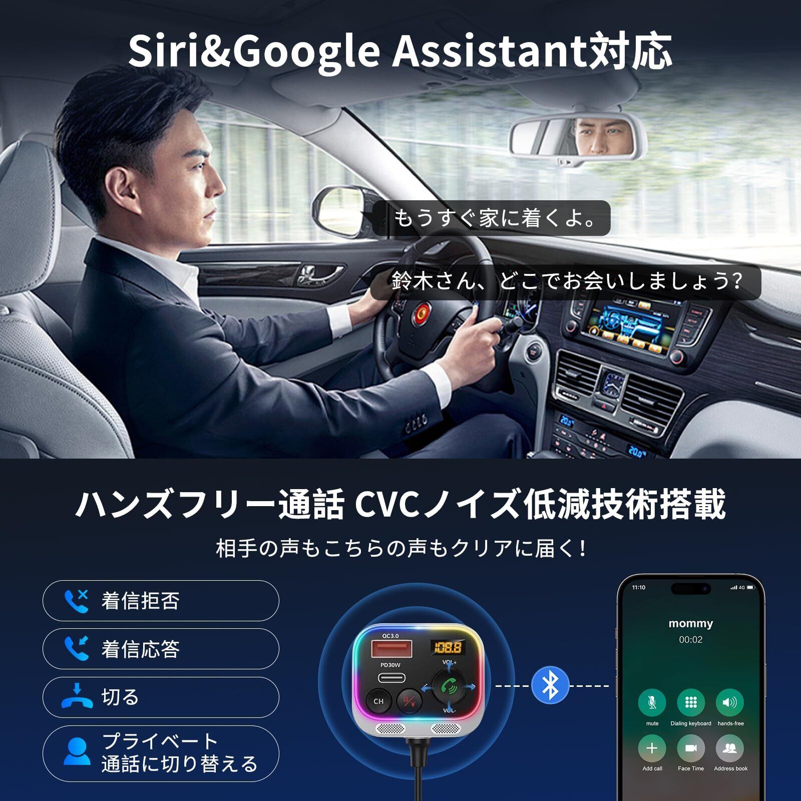 【Siri&Google Assistant対応・ハンズフリー通話】:当車載用FMトランスミッターはSiri&Googleアシスタントに対応しているため、クリックするだけで電話の発信などの操作ができ、ニュースや音楽、天気情報を聴け、心地いいで移動時間を充実されます。運転中の通信も安心、面倒な操作は不要でワンプッシュで手軽にハンズフリーで通話が可能になりました。あなたの安全をしっかり守ります。