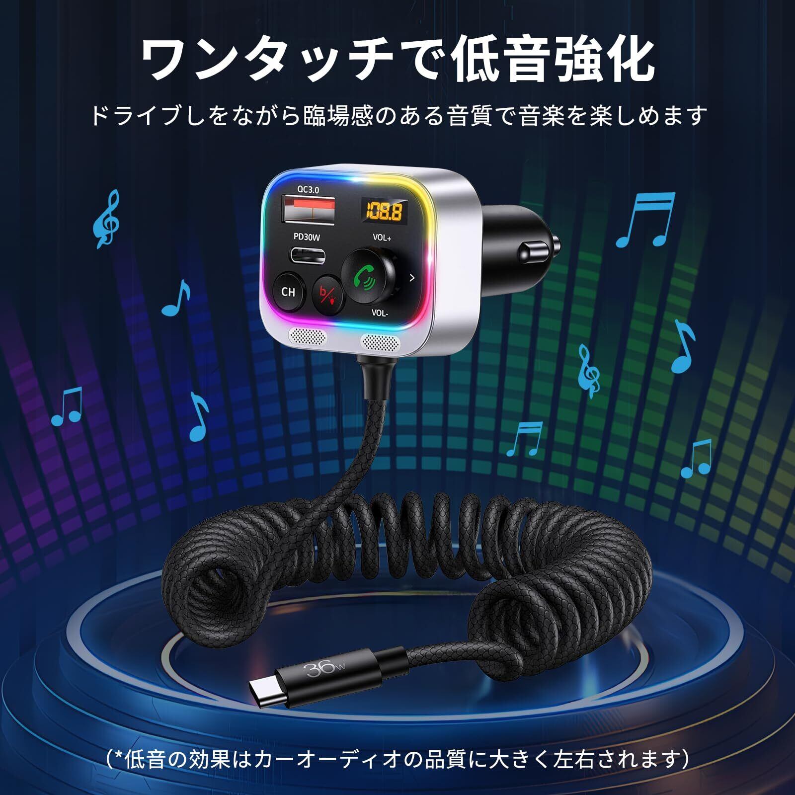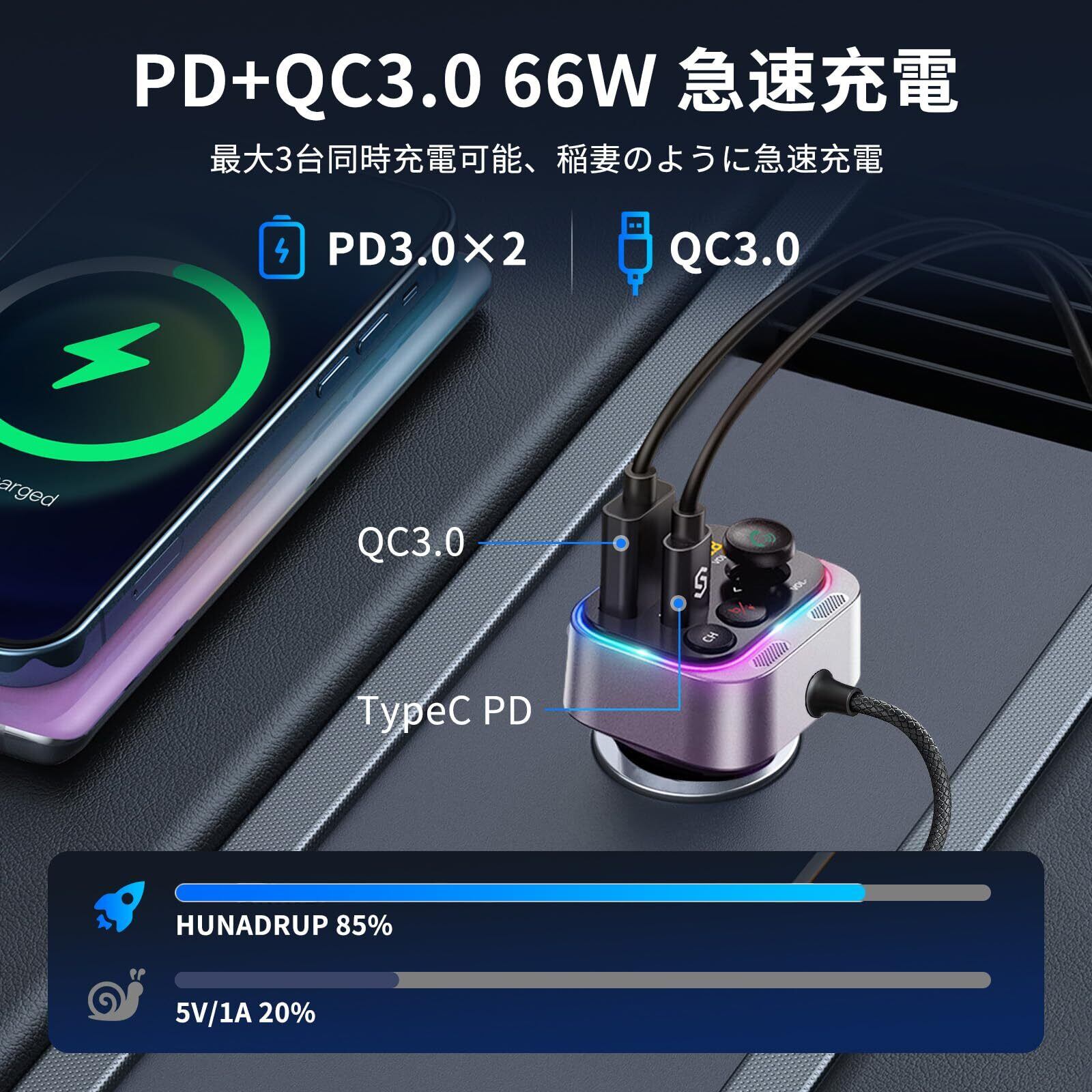 FMトランスミッター HUNDRUP Bluetooth5.4新登場 車載FMトランスミッター PD QC3.0急速充電 合計66W コイル型Type-Cケーブル付き 重低音ブースト Siri&Google Assitant 車載充電器 ハンズフリー通話 12V-24V車対応 LEDディスプレイ 7色ライト 電圧測定 日本語説明書 FM76.0-108.0MHz C79