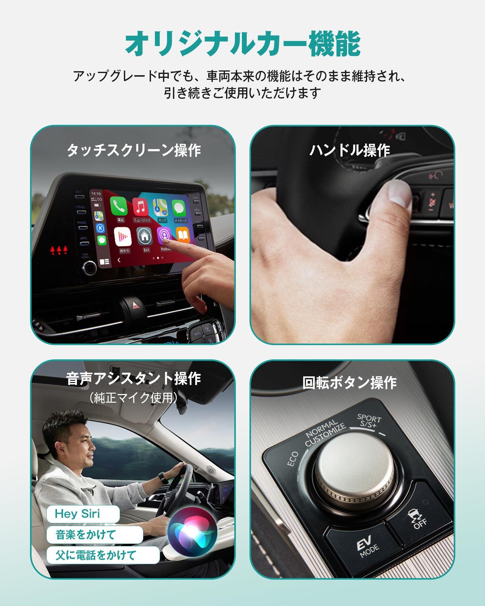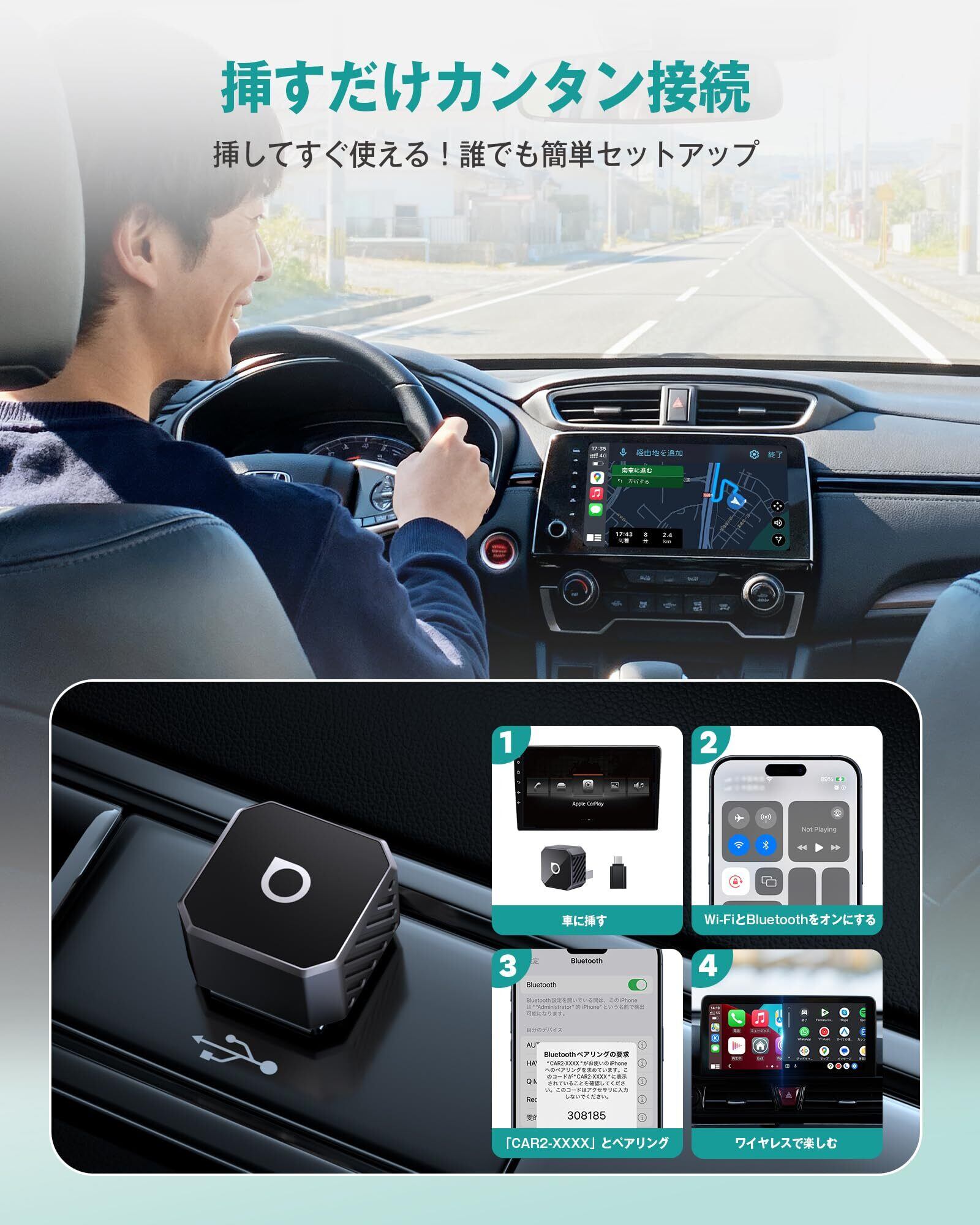 【軽量コンパクト&簡単操作】 小型・軽量設計で持ち運びにも便利。車内スペースを占有せず、設置も簡単。追加ドライバ不要でプラグアンドプレイに対応。初回設定後は、エンジン始動時に自動でワイヤレス接続が開始されるため、毎回の接続操作は不要。ケーブルレスで、スマートかつ快適な車内空間を実現します。