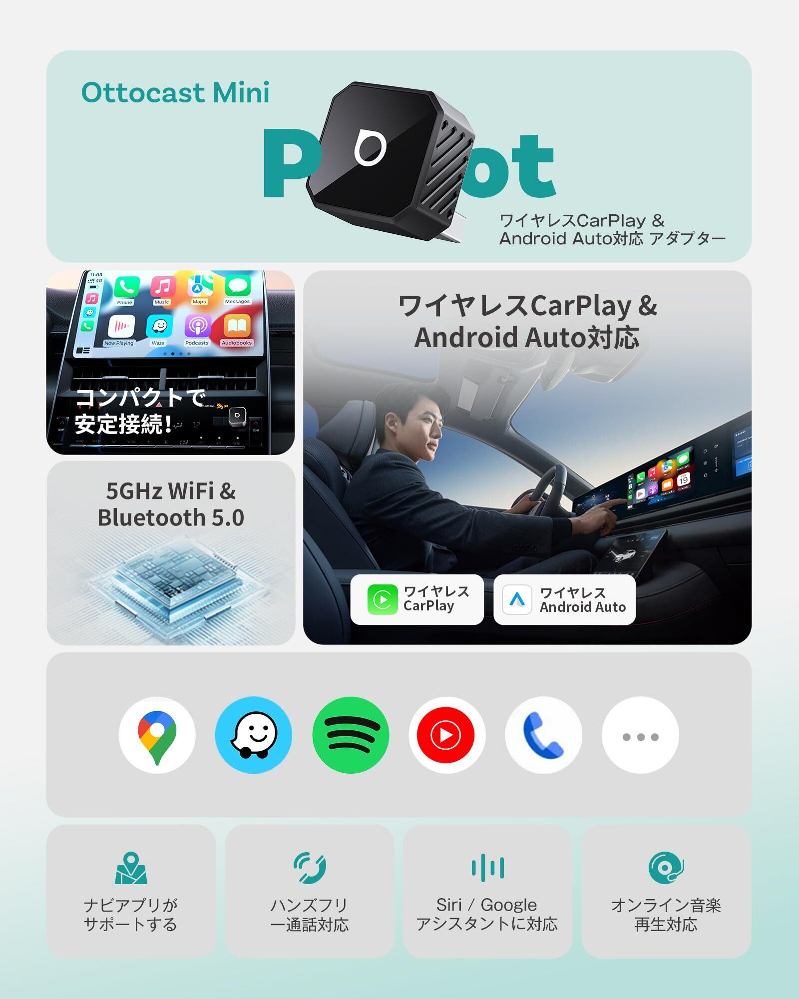 【ケーブルフリーで快適なワイヤレス接続】 車内でケーブルが絡まる心配はもう不要。OTTOCAST MINI Potは、純正の有線CarPlay/Android Auto USBポートに挿すだけで、ワイヤレスCarPlay/Android Autoを実現。98%以上の有線CarPlay/Android Auto搭載車種に対応し、プラグアンドプレイですぐに使用可能。毎回の煩わしいケーブル接続から解放され、乗車時に自動的にスマホと接続されます。