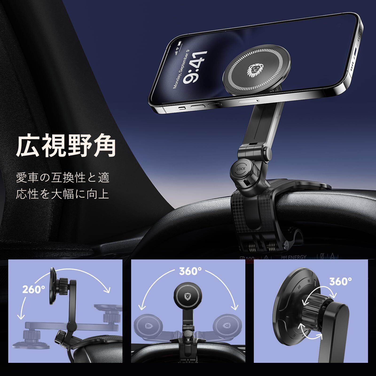 JunDa スマホホルダー 車用 360度回転 クリップ式 マルチ機能 ユニバーサル 携帯ホルダー 車 ダッシュボード/ルームミラー対応 全スマートフォン安定固定