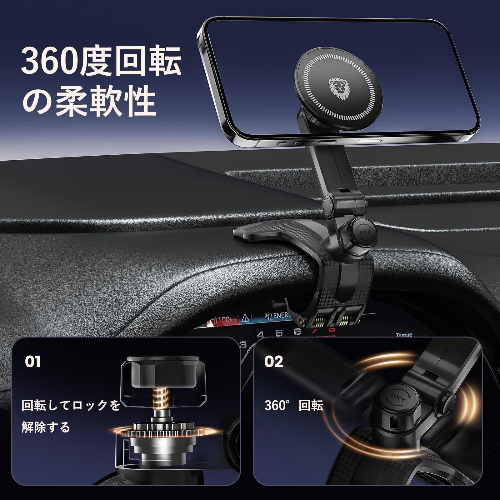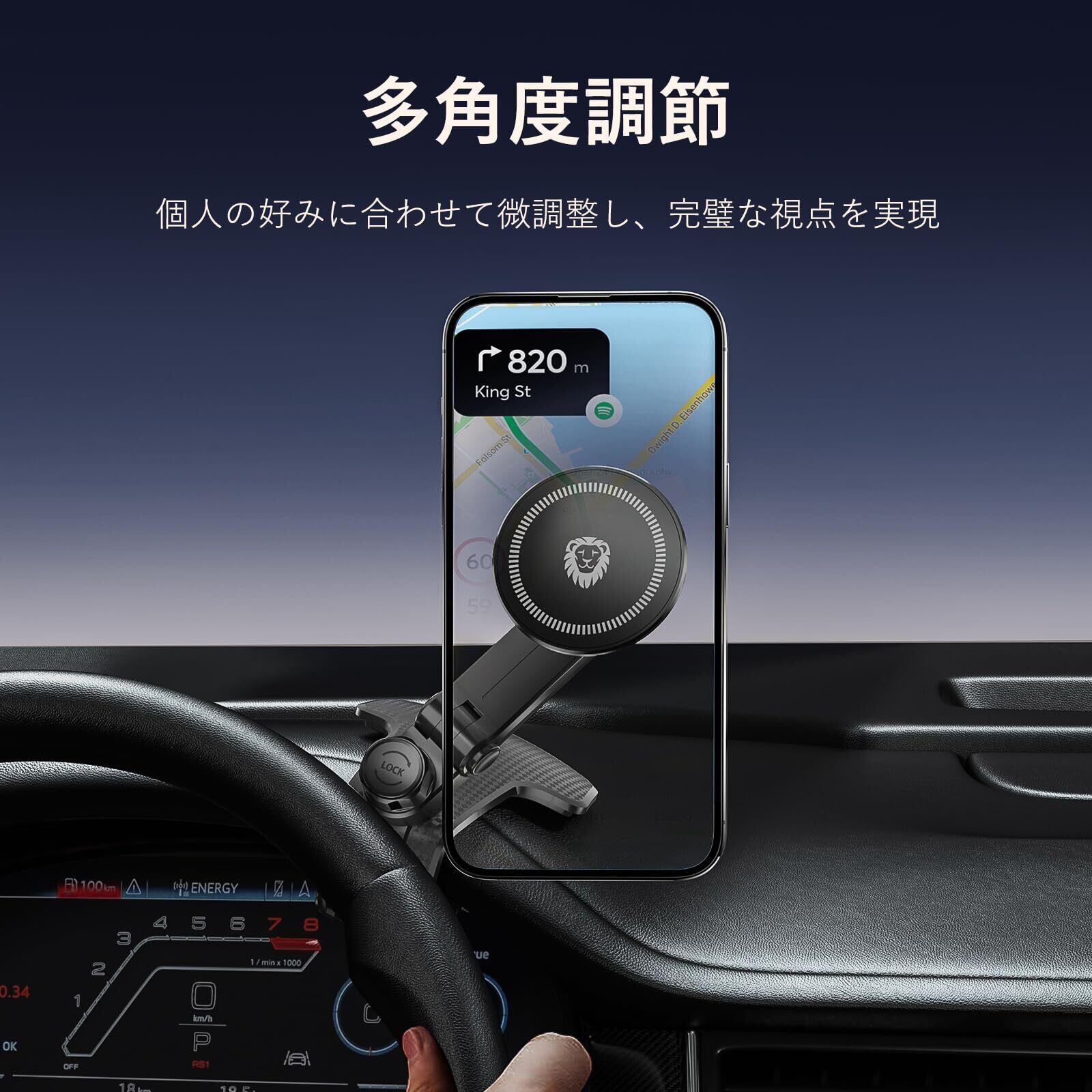 【工具不要の簡単取り付け】 強力なスマホホルダー クリップ設計で、ダッシュボードなどに挟むだけでしっかり固定。滑り止めパッド付きで表面を傷つけず、携帯ホルダーとしての機能を十分に発揮します。