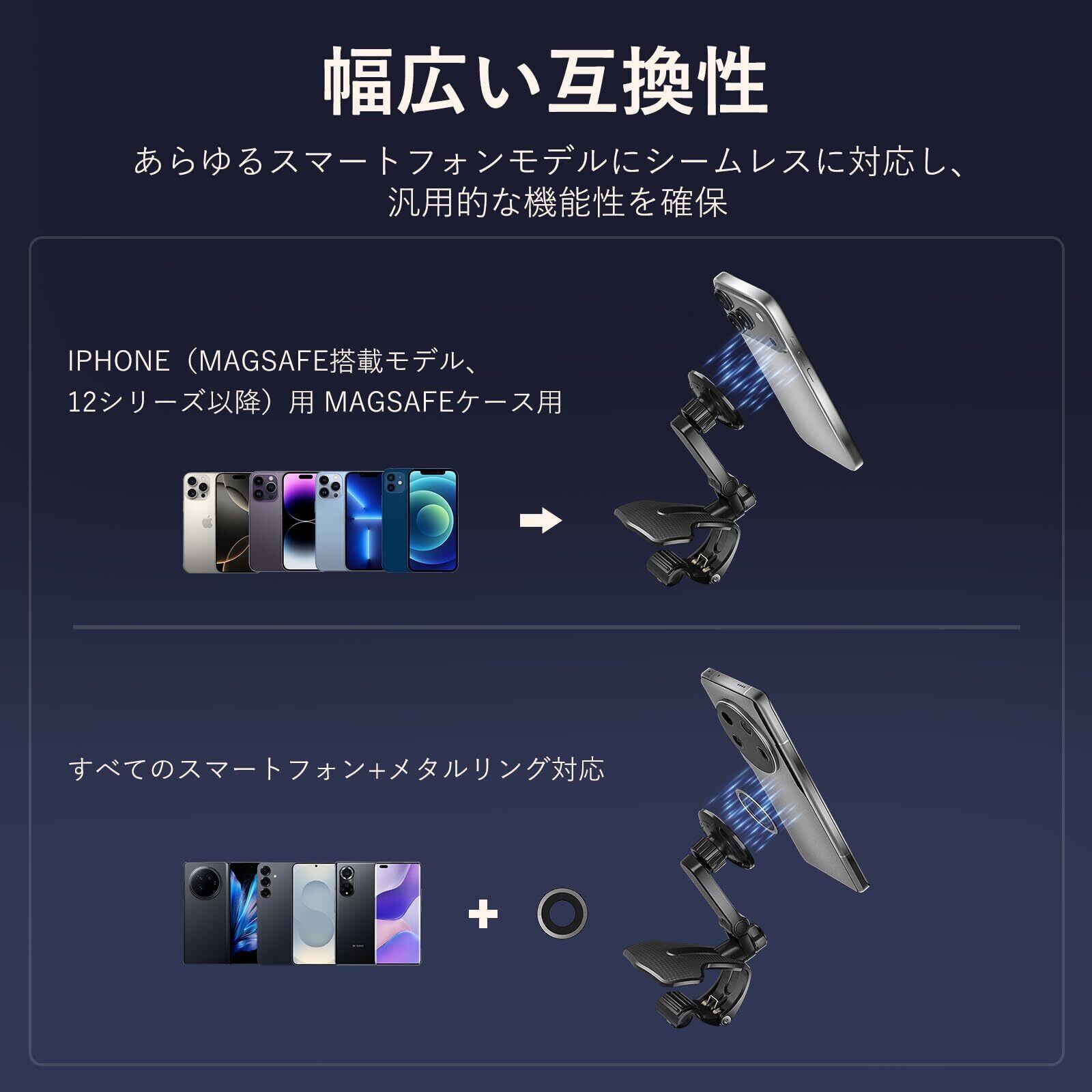【広範な互換性と安定保持】 ほとんどのスマートフォンに対応。しっかりしたクランプとボールジョイントで、振動が多い道でもスマホを安定保持。優れた車載スマホホルダーです。