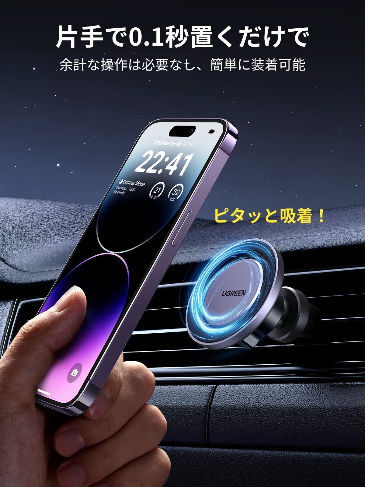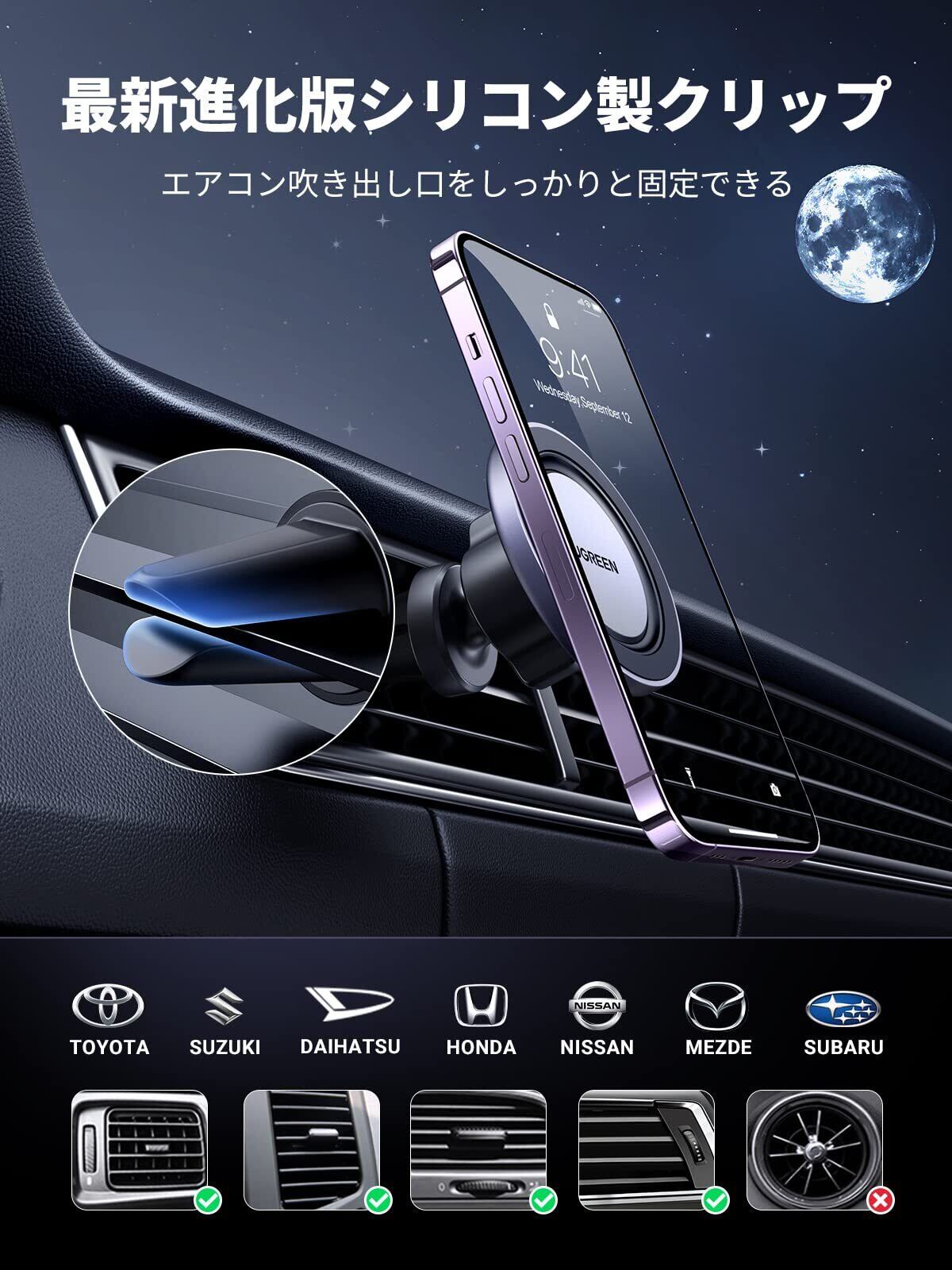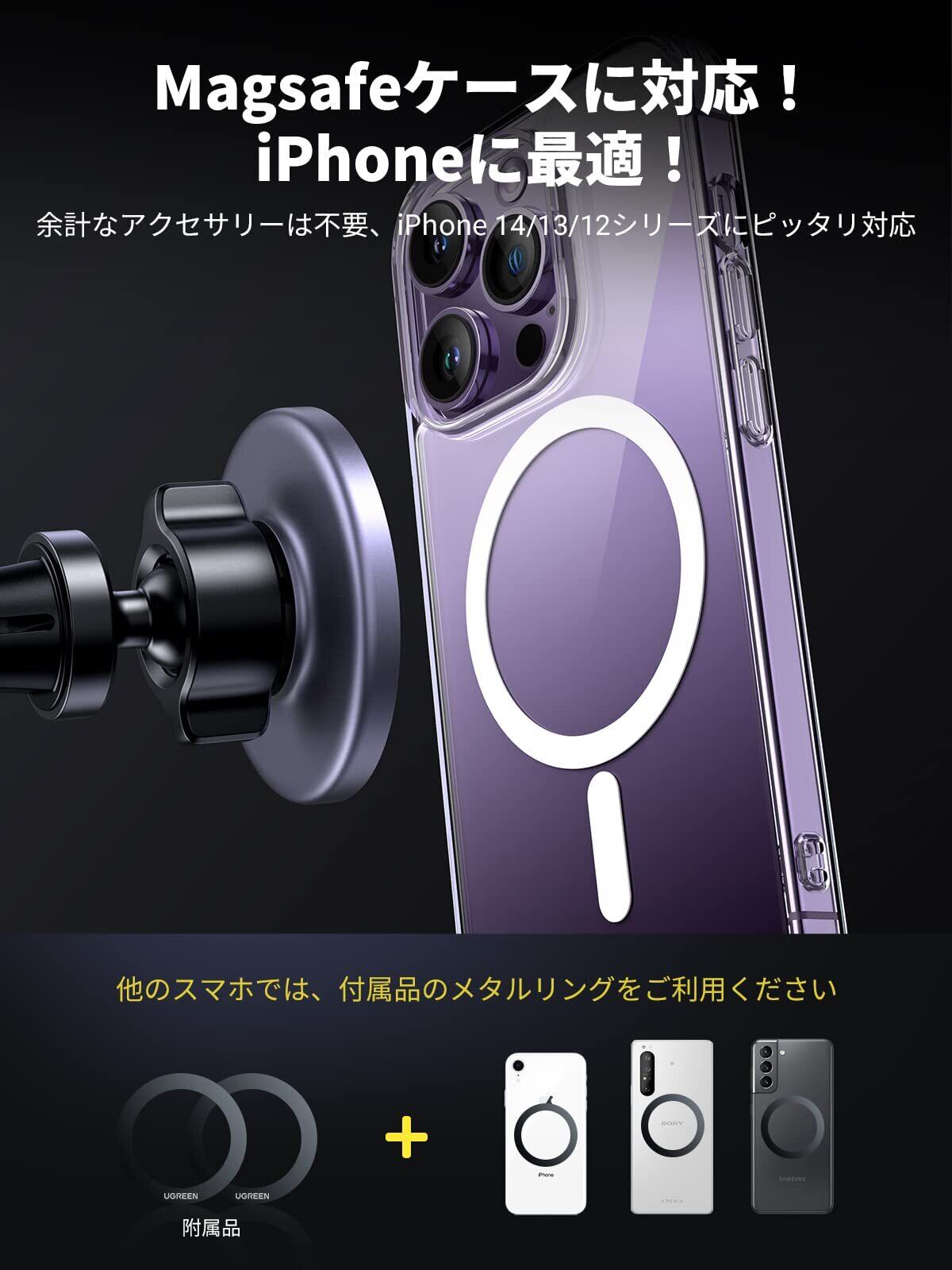 UGREEN 車載ホルダー マグネット式 magsafe対応 超強磁力 片手操作 車 スマホホルダー 車 携帯ホルダー エアコン吹き出し口対応 360°回転可能 安定性 取り付け簡単 4.3-7.6インチ対応 iPhone 17/16/15/14/Samsung/Xperia/LG/Huaweiなど対応
