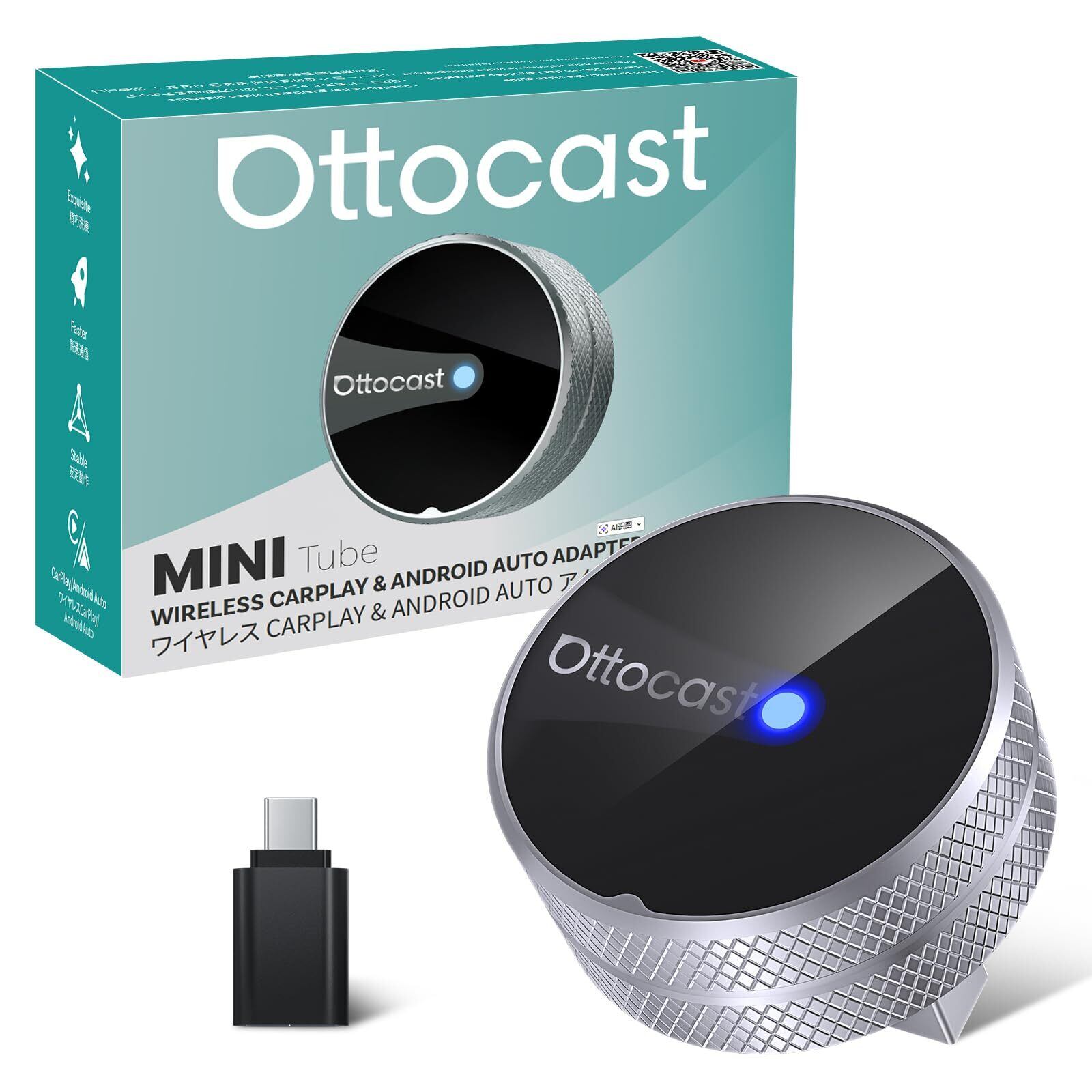 Ottocast Mini Tube オットキャスト ワイヤレスCarPlay/Android auto アダプター 2回目自動接続可 iPhone・Android Auto両対応 2台スマホ接続可 siri/Googleマップ/Spotify/LINE音声など実現 純正操作 コンパクトサイズ 技適認証取得済み 純正有線CarPlay/Android auto搭載車適合