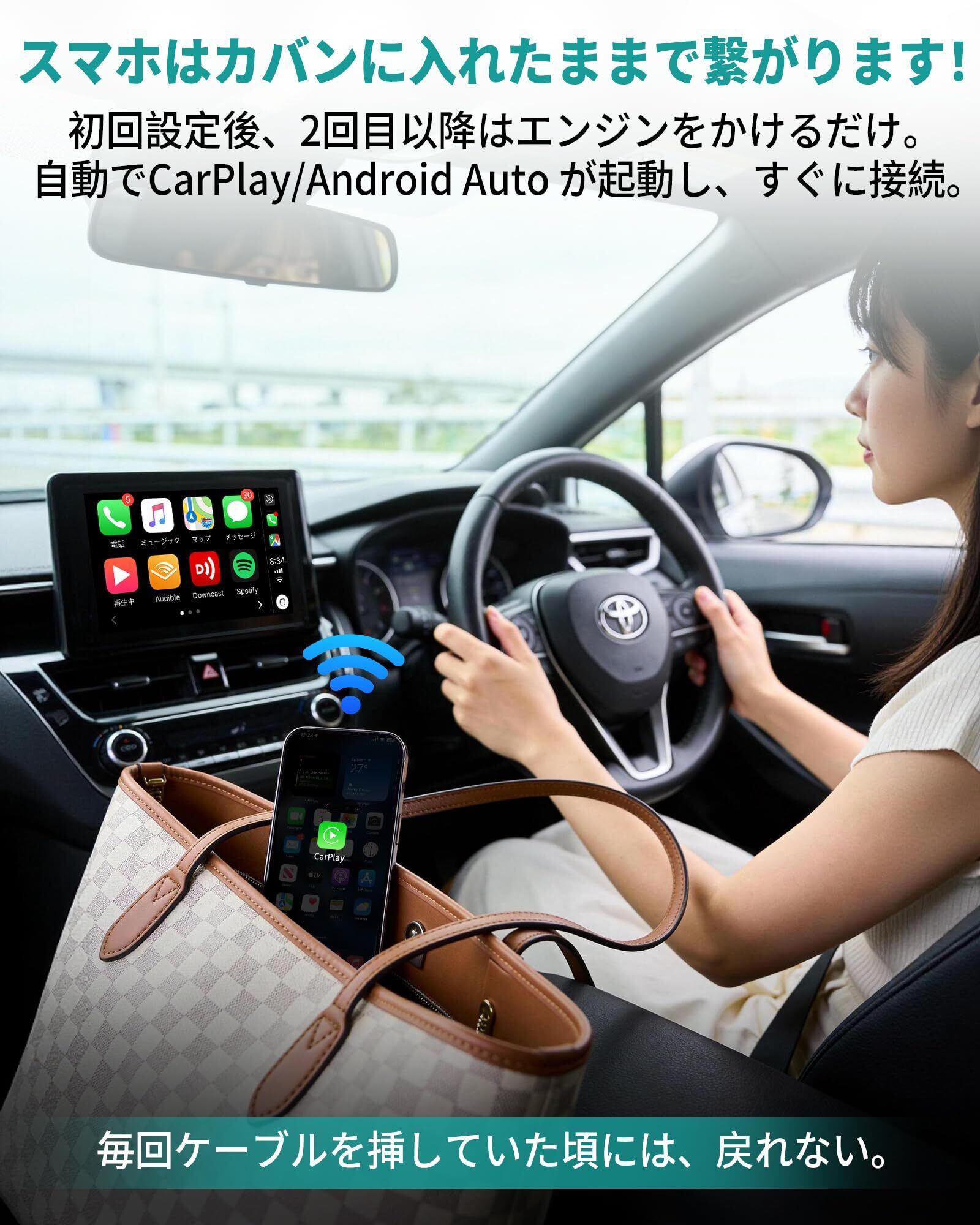 「ケーブルの煩わしさから解放」乗り降りのたびにケーブルを抜き差しする手間から解放されます。ワイヤレス接続なので車内はスッキリ、配線が絡まることもなく、見た目も操作性も快適に。毎日の運転がぐっと楽になります。
