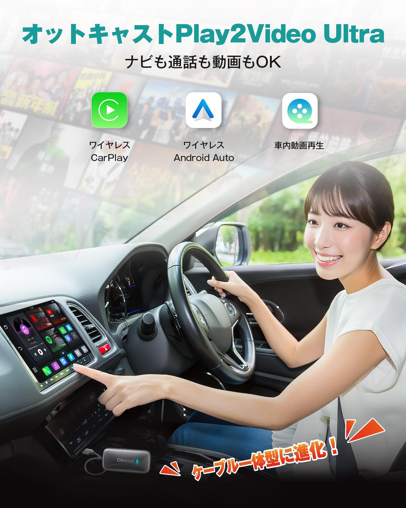 オットキャスト ottocast Play2Video Ultra カープレイai ボックス 車内で人気アプリ YouTube/Tiktok等観れる CarPlay/Android Autoワイヤレス化 車 動画 純正有線CarPlay対応車に適合 無線接続でiPhone/Android両対応 長距離ドライブ便利グッズ カーアクセサリー