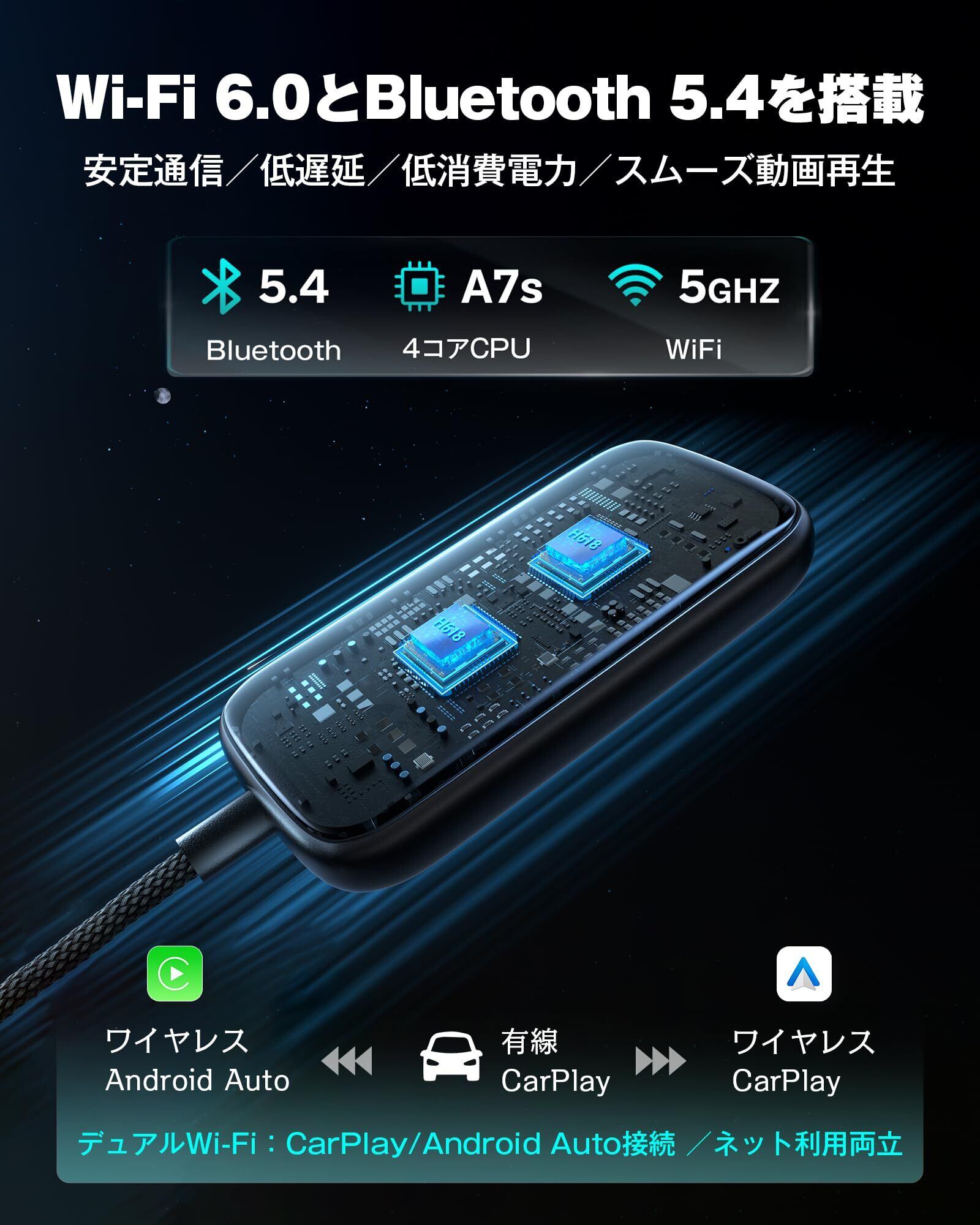 【CarPlay・Android Autoを完全ワイヤレス化】これまで有線接続が必要だったCarPlay/Android Autoを、無線接続でスムーズに利用可能。「Hey Siri」「OK Google」でナビ操作や音量調整などもハンズフリーで行えます。毎回ケーブルを差す手間も不要になり、出発もスムーズ。より安全で快適なドライブをサポートします。