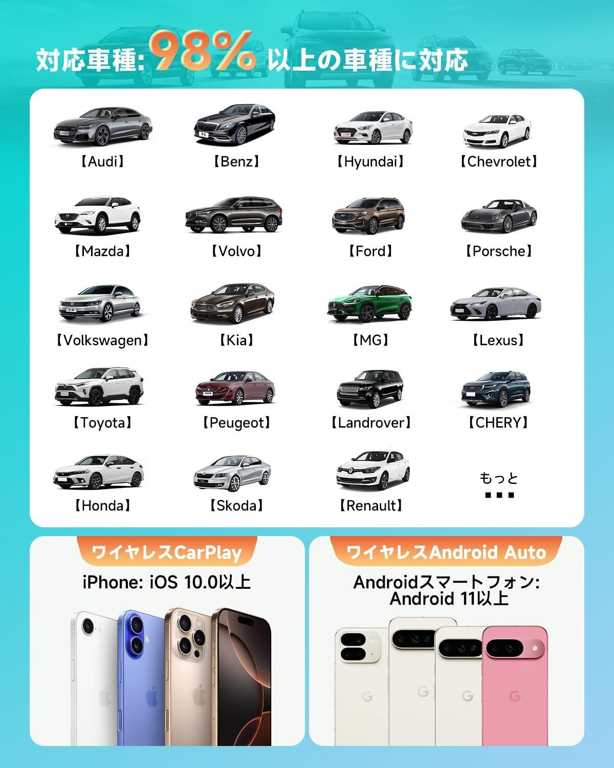 対応デバイス Android 11.0以上(そしてワイヤレス android autoをサポート), iPhone 6以上;IOS 10以上(そしてワイヤレス carplayをサポート)