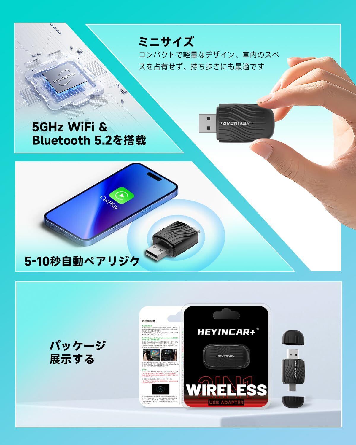 HEYINCAR+ ワイヤレスCarPlay/Android Auto アダプター CarPlay&AndroidAutoをワイヤレス化 アダプタケーブル不要 純正な有線CarPlay/Android Auto搭載する車専用 Bluetooth/音楽/多言語対応 ワイヤレスディスプレイ 自動接続 技適認証取得済み 日本語取扱説明書付き
