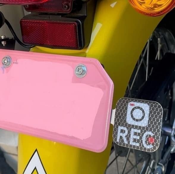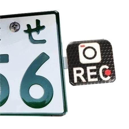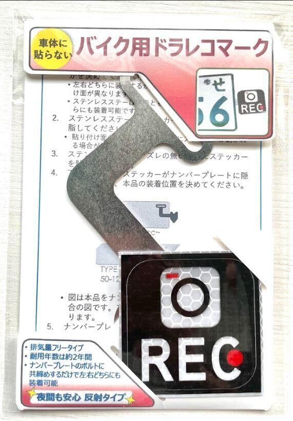 バイク(オートバイ)用のちっちゃいドラレコ(録画中)マークです。 車のドライバーからもはっきりと認識できるので、後続車に意識して貰えるようになるお助けアイテムです。 ライディングに不安がある方や、バイクに慣れていない方、峠道が苦手な方などにオススメです。 (初心者マークはちょっと恥ずかしいという方にも!) 録画中を掲示することで周囲の車両へ対して、危険運転、あおり運転を抑止する効果を期待できます。 ※ステンレスステー1枚、ステッカー1枚のセットです。 ナンバープレートのボルトに共締めして使います。 ステーはステンレス製ですので錆びの心配がありません。ステッカーはリフレクター(再帰反射)タイプですので、夜間の視認性も抜群です。 ステンレス・ステーは1.2mm厚のSUS304 2Bを研磨で仕上げ処理しています。 ステッカーには屋外用強粘着タイプを採用していますので、約2年間の耐用年数となります。