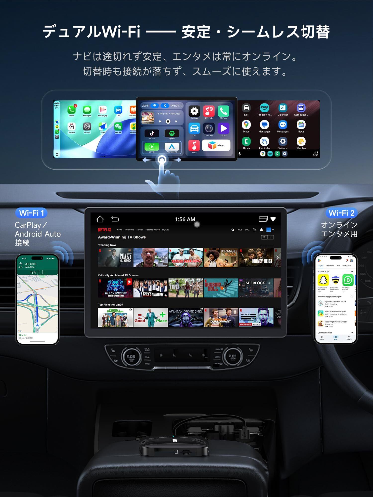 デュアルWiFi:CB4にはデュアルWiFiモジュールを搭載。CarPlayやAndroid Autoを使用中でもインターネット接続を維持でき、ナビゲーションや音楽ストリーミング、その他のオンラインアプリをスムーズに利用でき可能