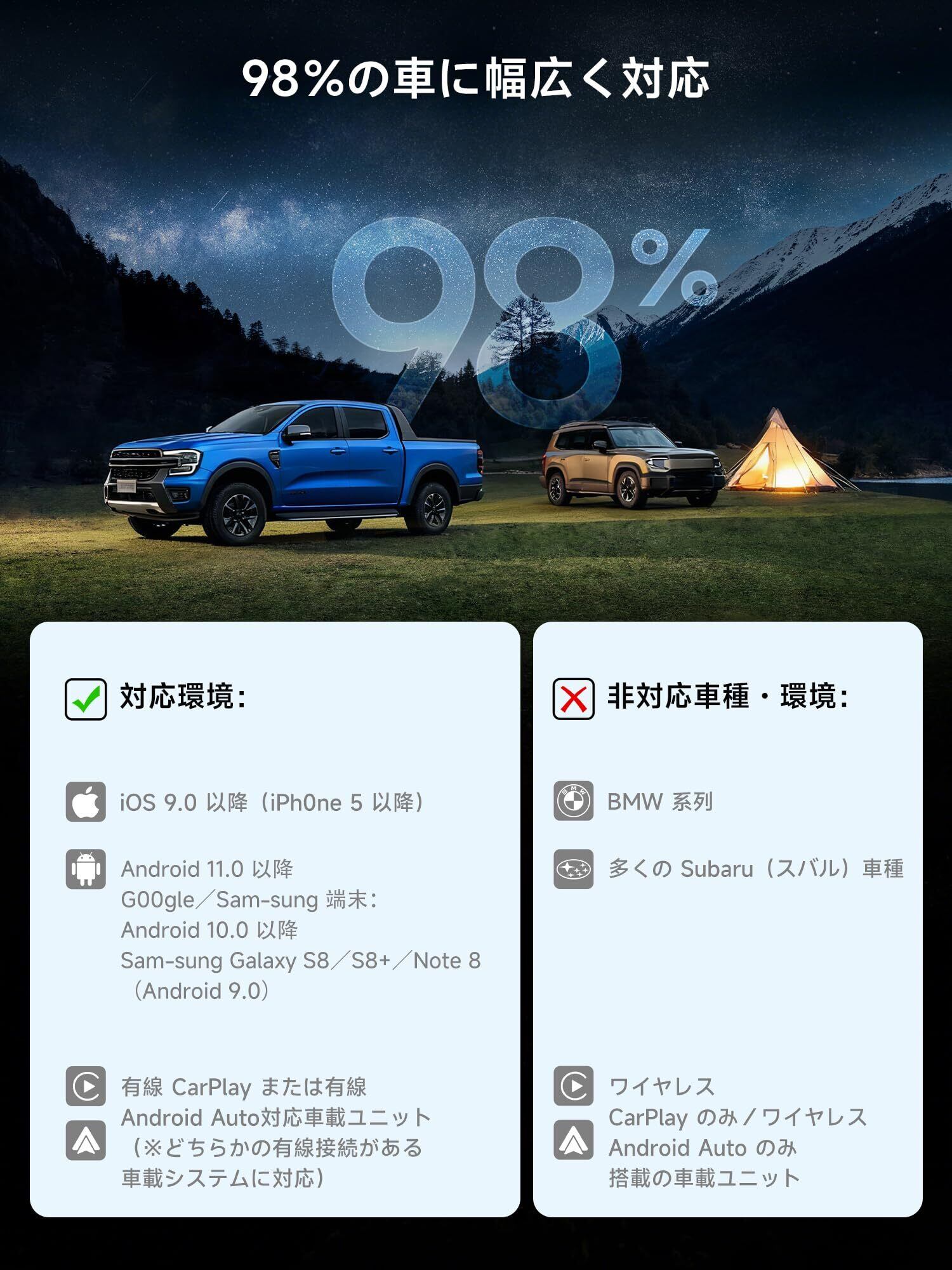 ワイヤレス接続に変換:CB4 Android Boxを使用して、有線CarPlayまたはAndroid Autoをワイヤレスに変換可能。純正・社外品のカーステレオで、有線CarPlayまたは有線Android Autoに対応している場合、どちらか片方のみ対応の機種でも利用可能
